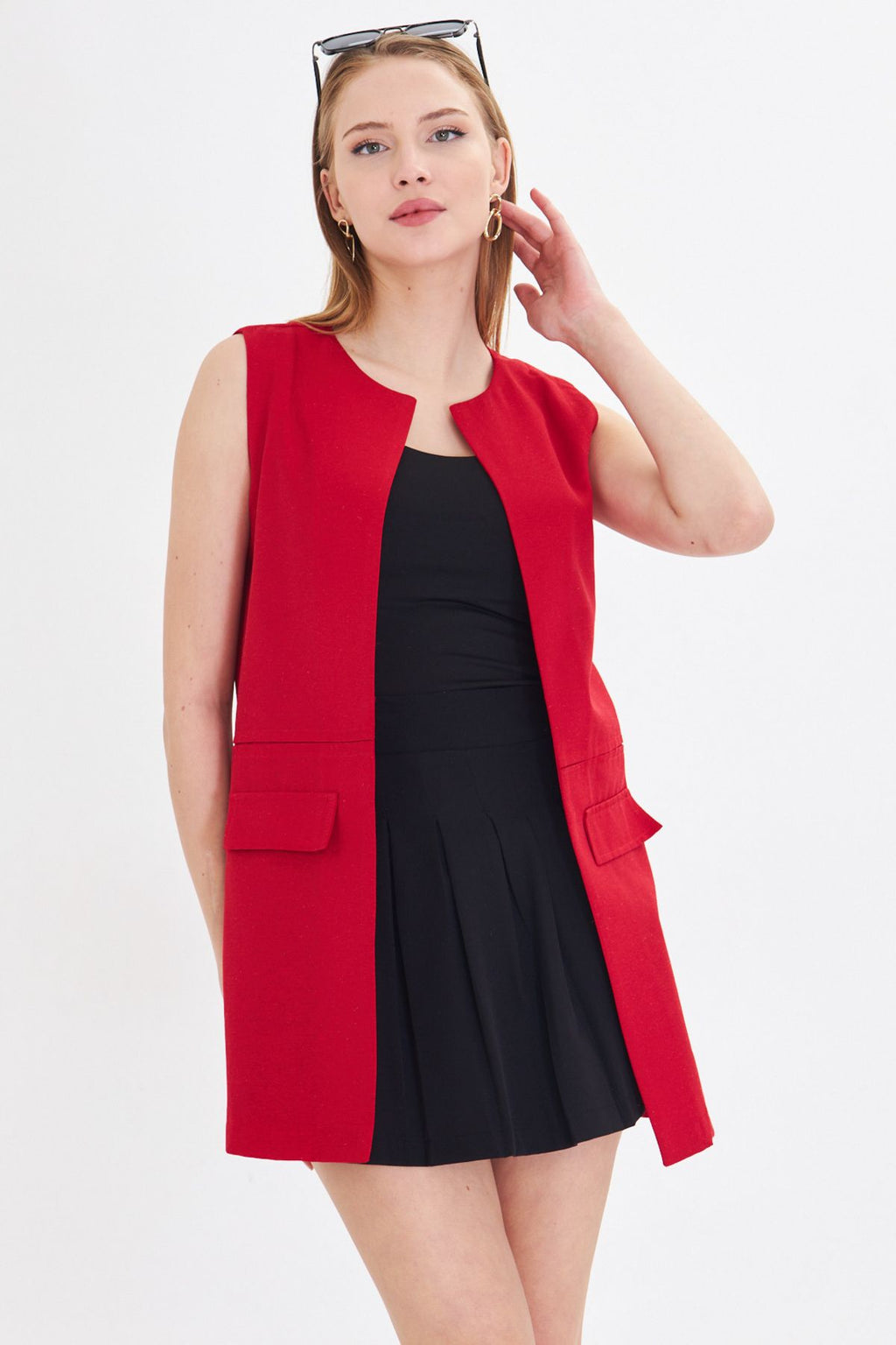 Woman Red Zero Yaka Sewing Detailed Vest on the waist Arm-25y001019
