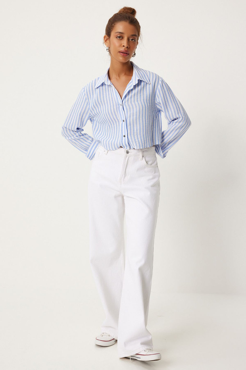 Woman Sky Blue White Obedness Detailed Striped Crop Shirt FN03259
