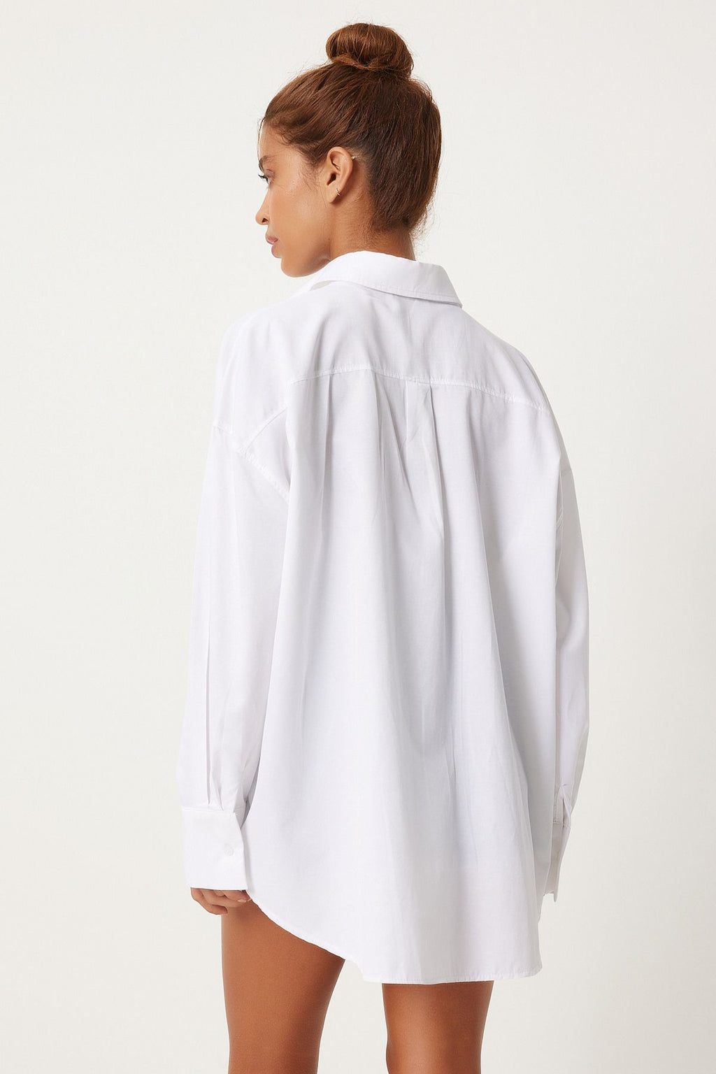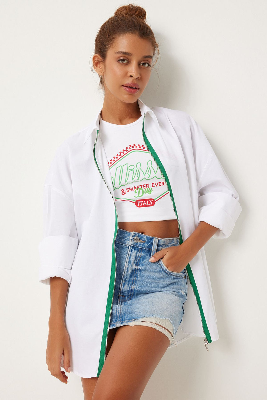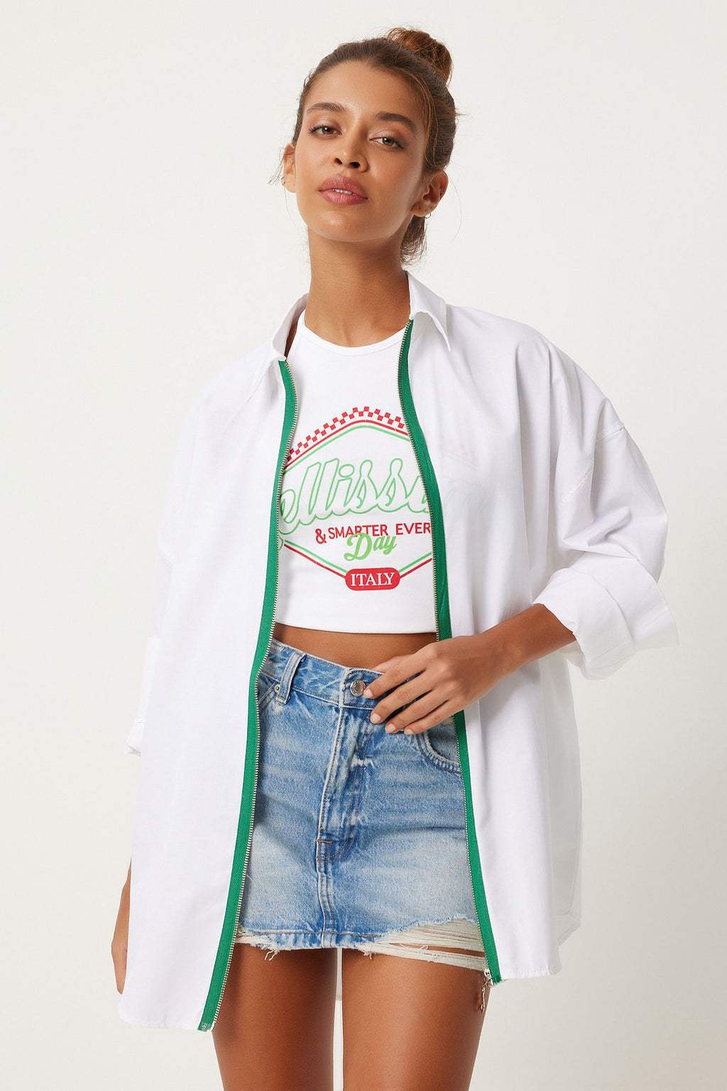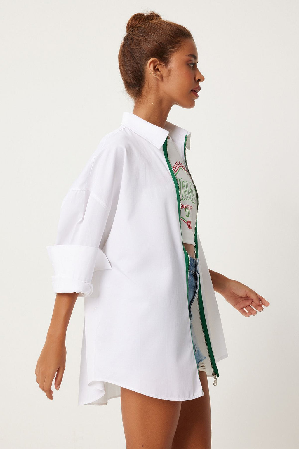 Woman White Green Contrast Ribbon Zippered Oversize Shirt FN03263