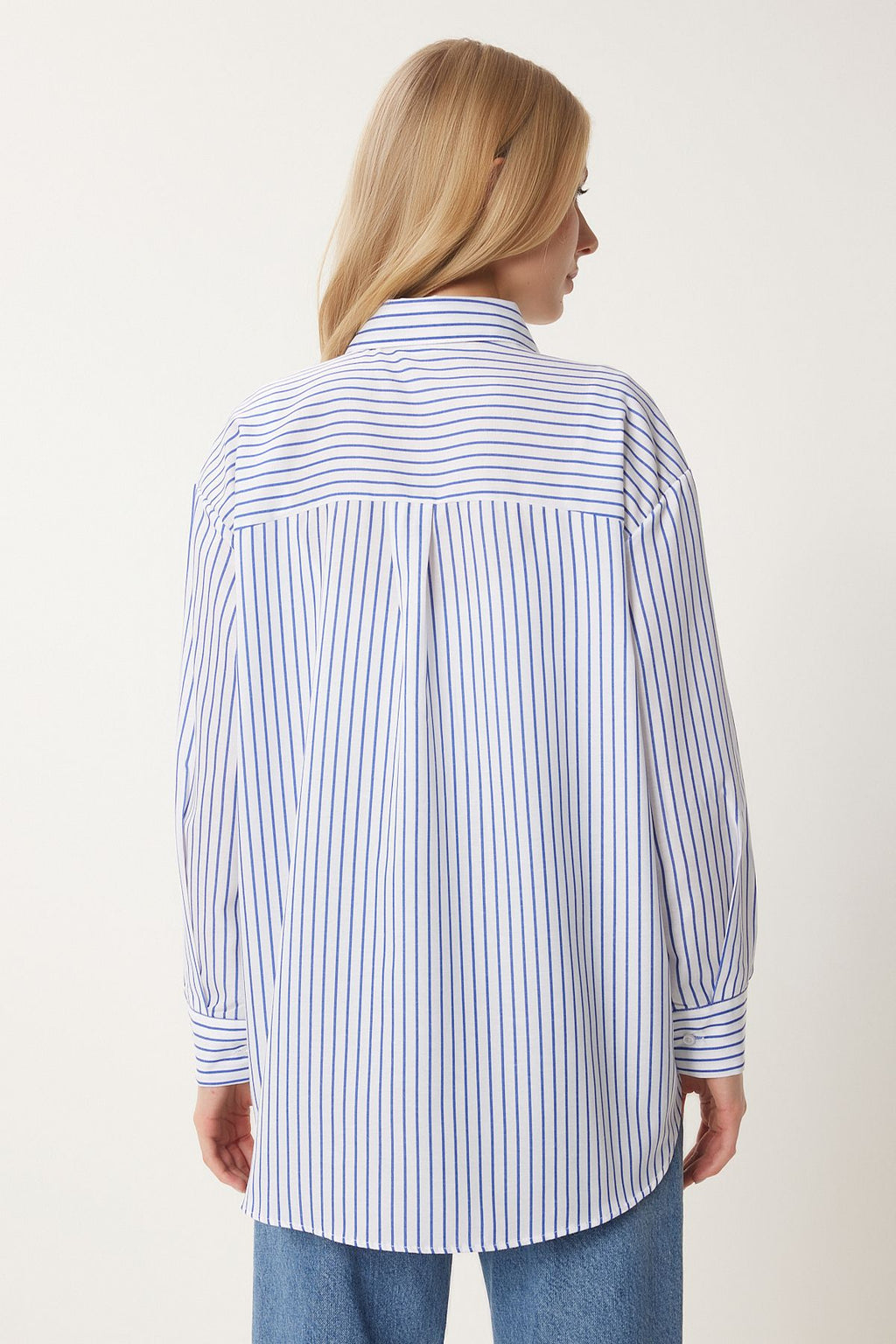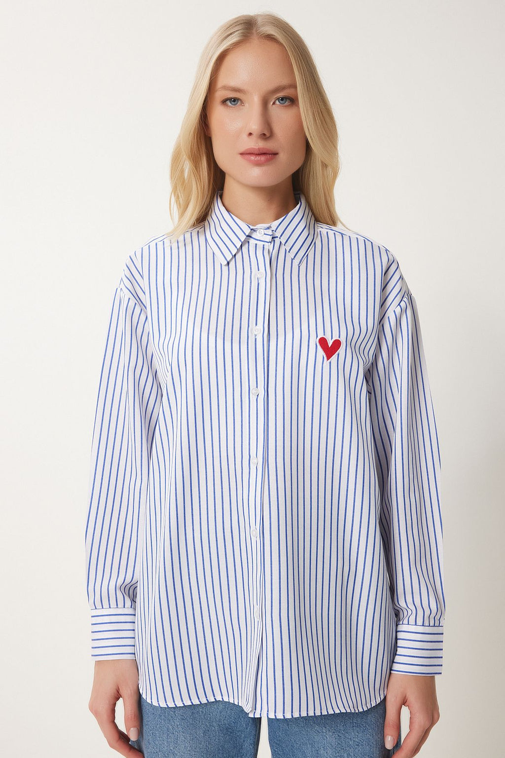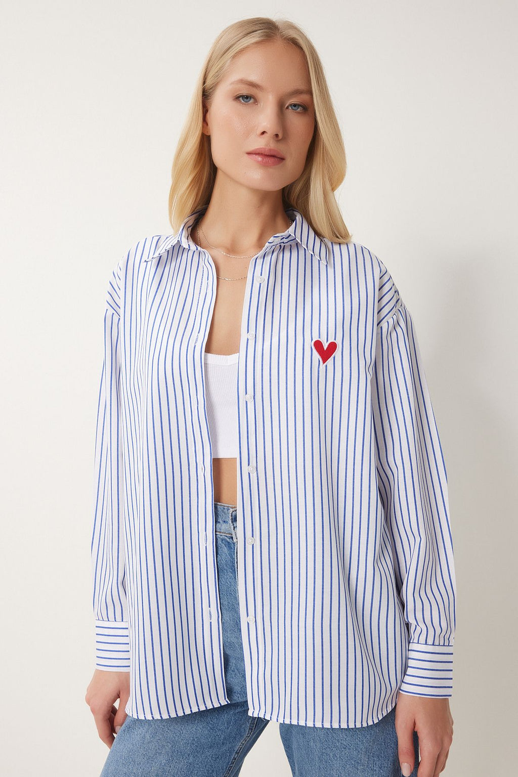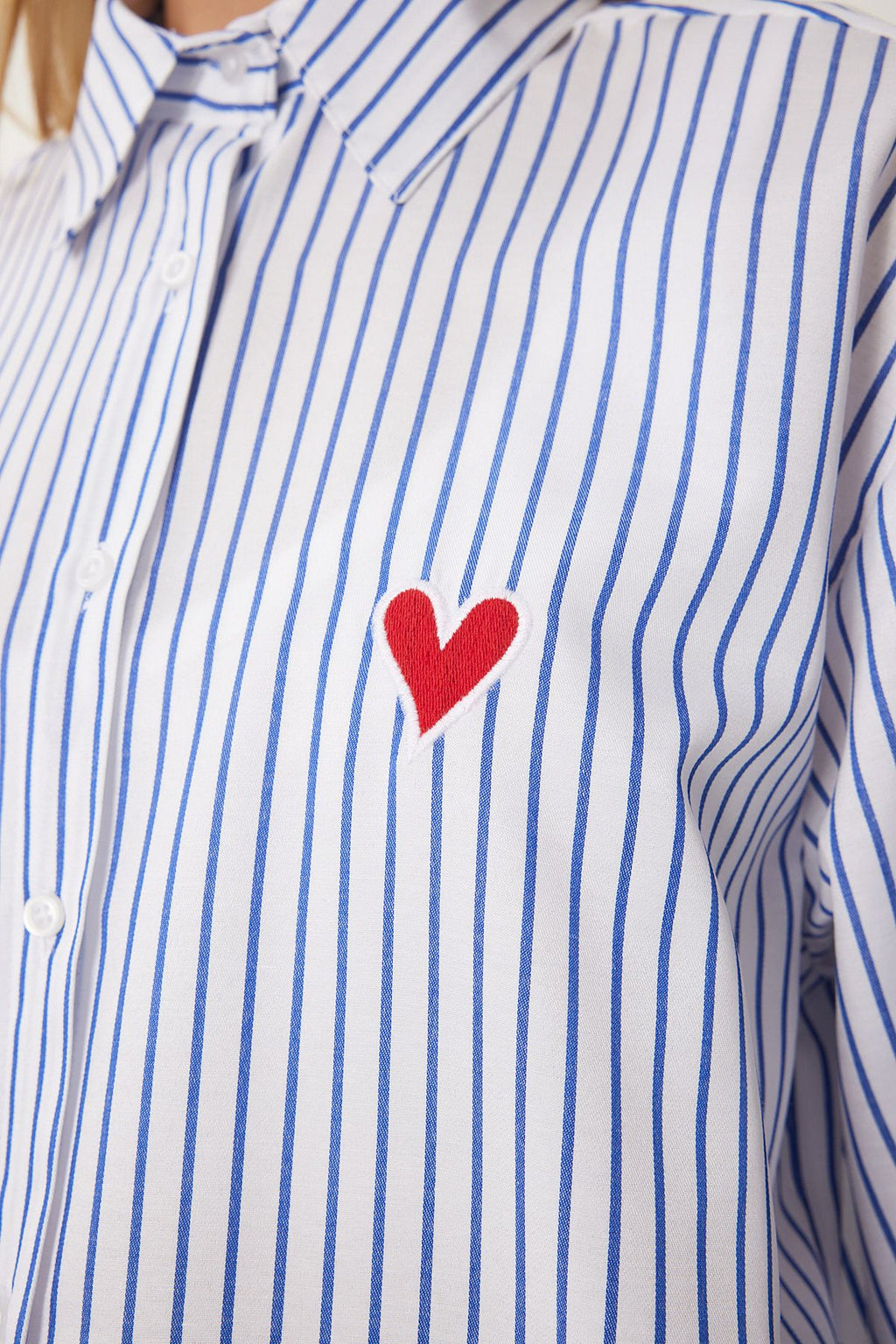 Woman White Heart Embroidered Striped Oversize poplin shirt DX00016