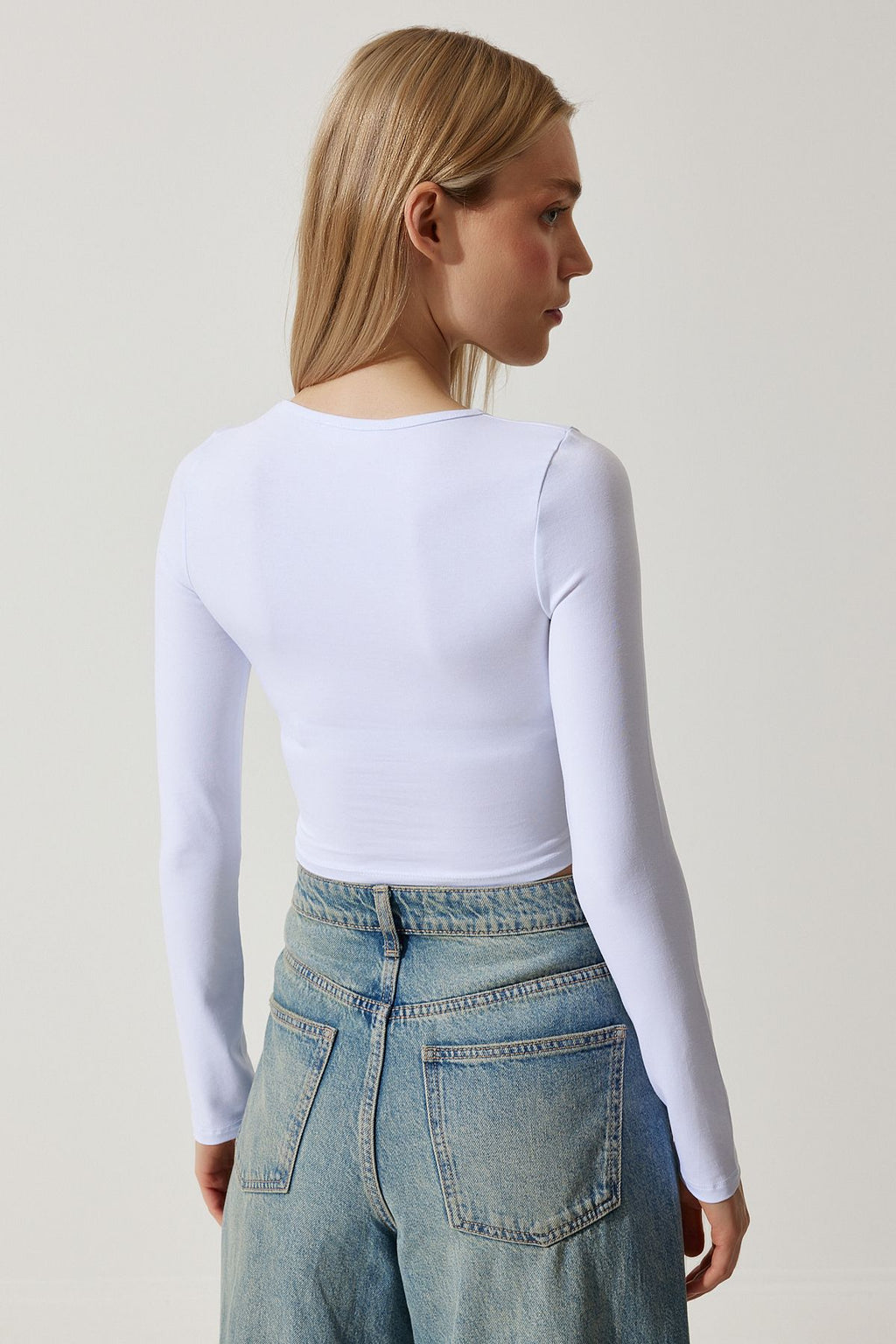 Woman White Indigo Blue Bicycle Collar Basic 2 Plop Crop knitted blouse OW00035