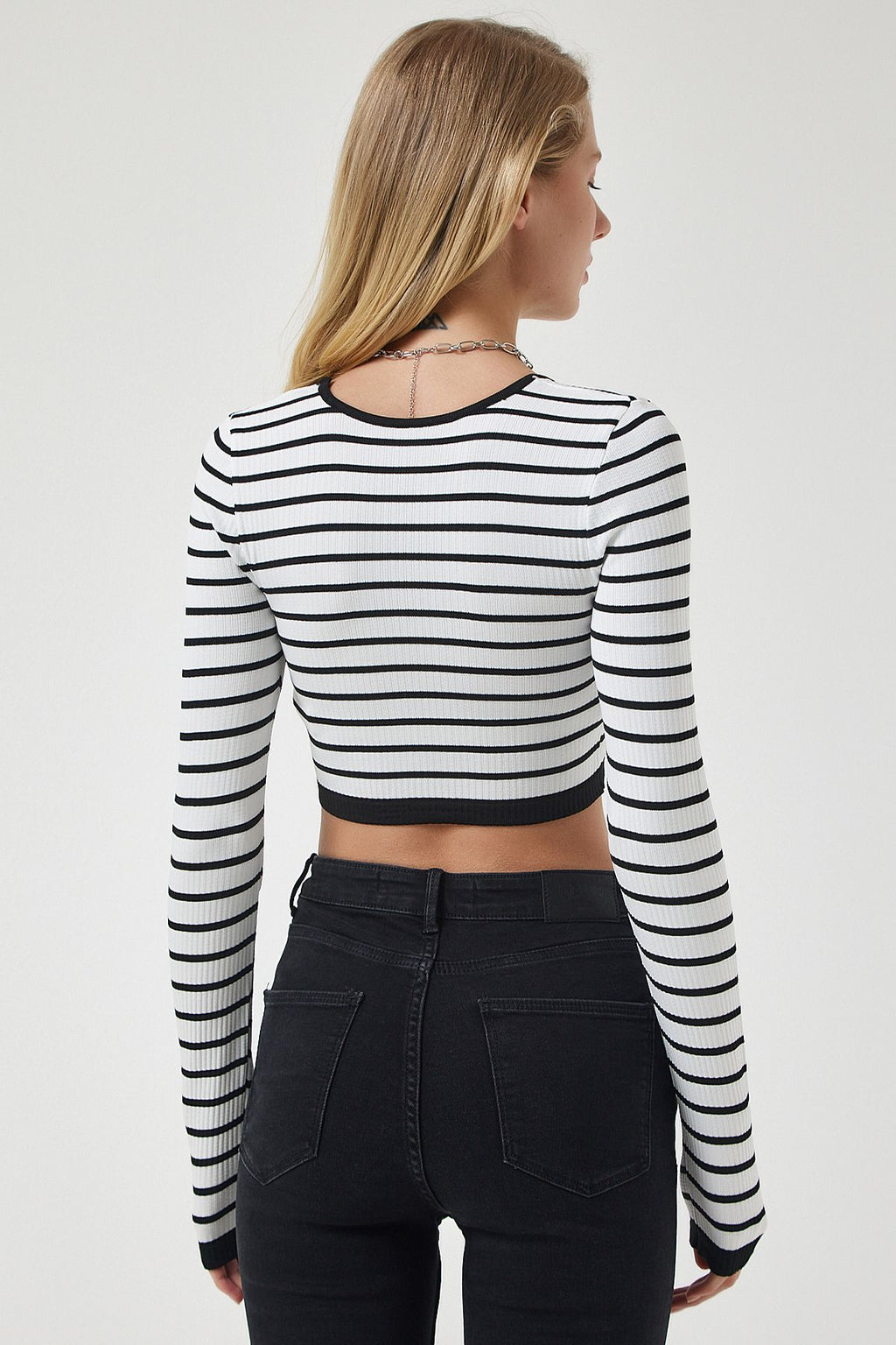 Woman White Striped Crop Triko Blouse PF00067