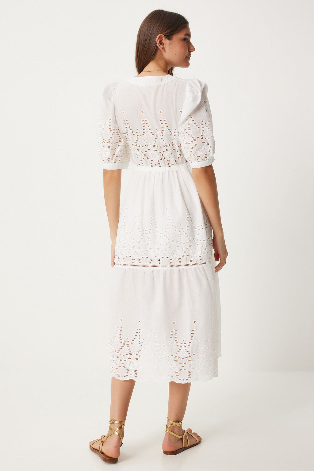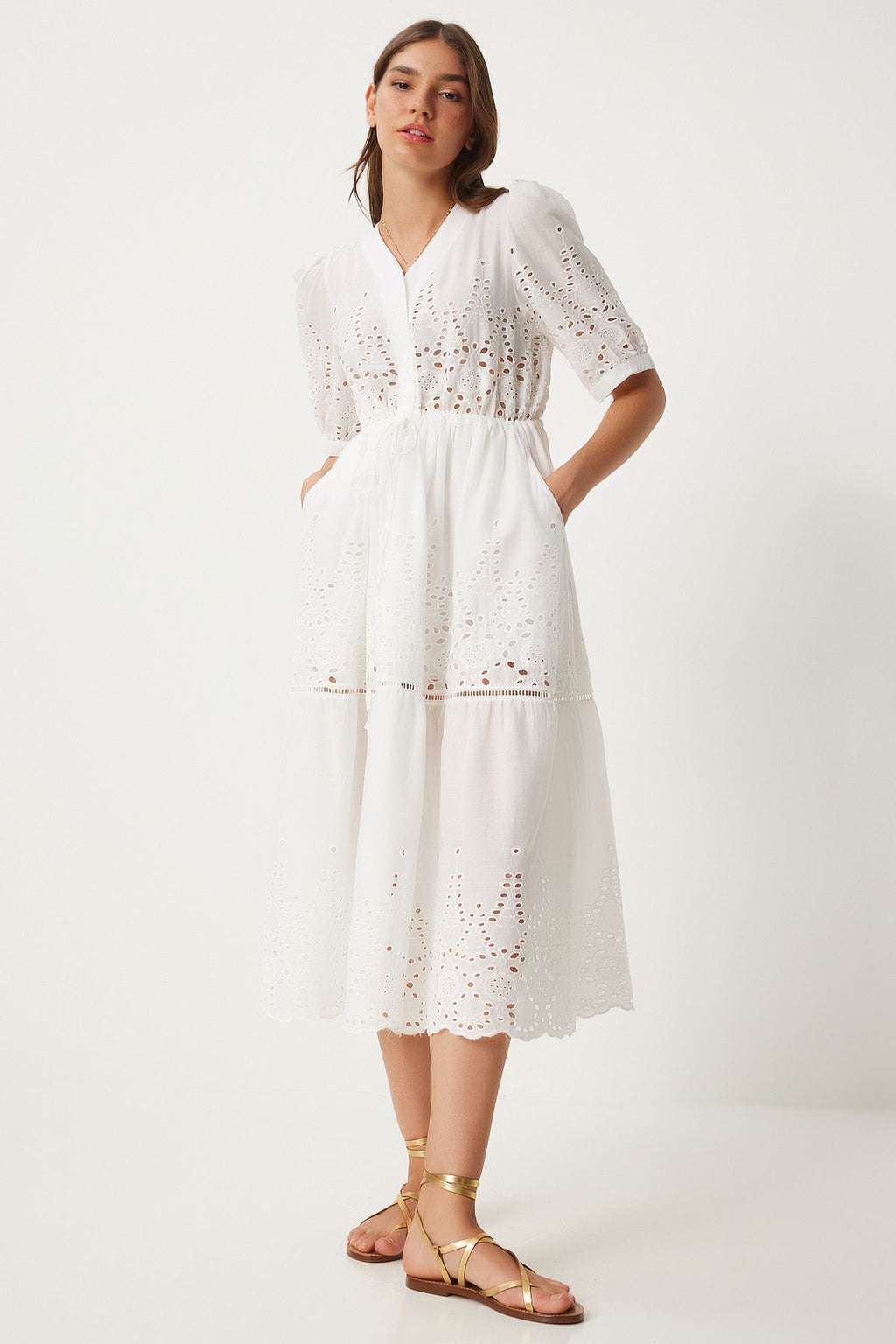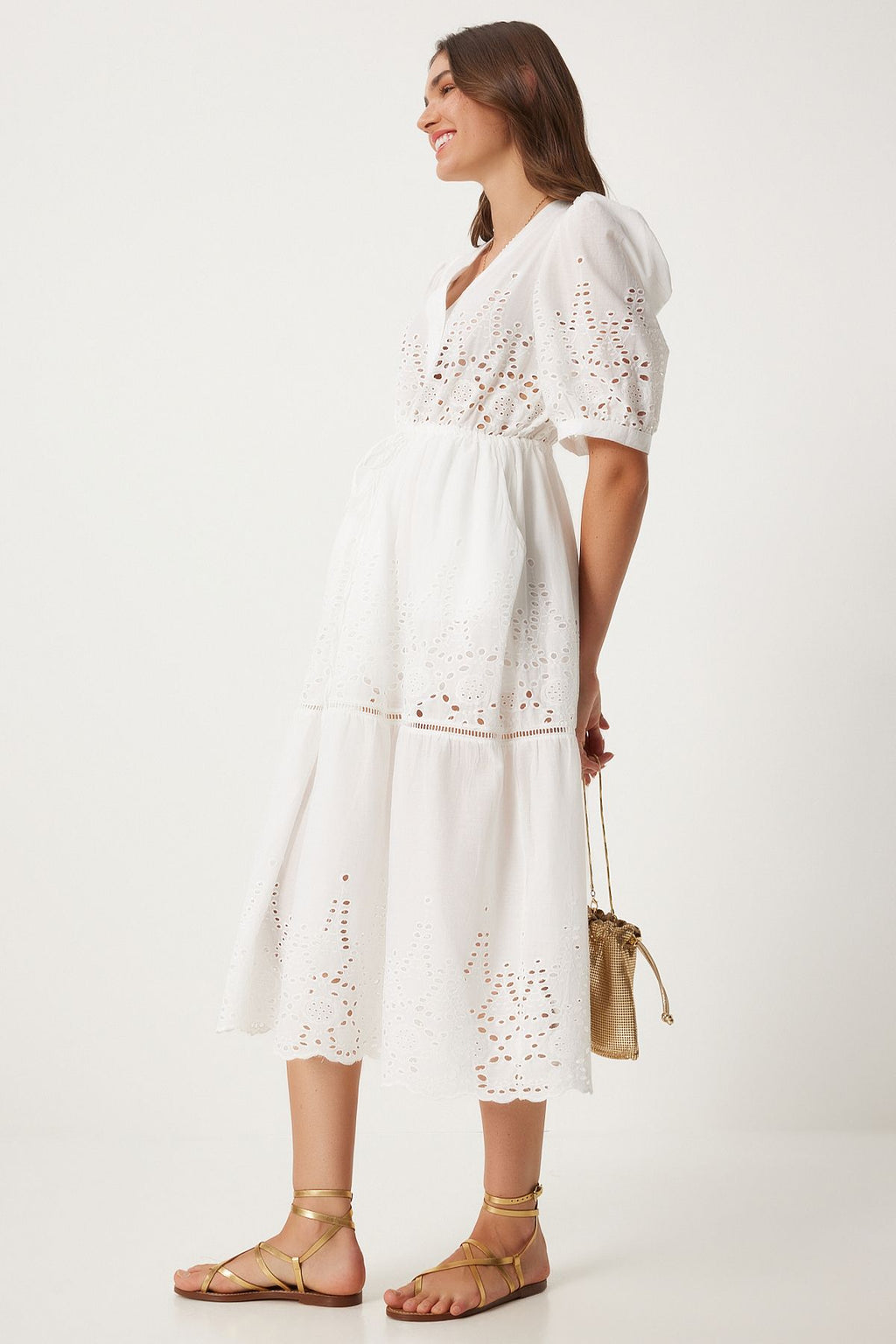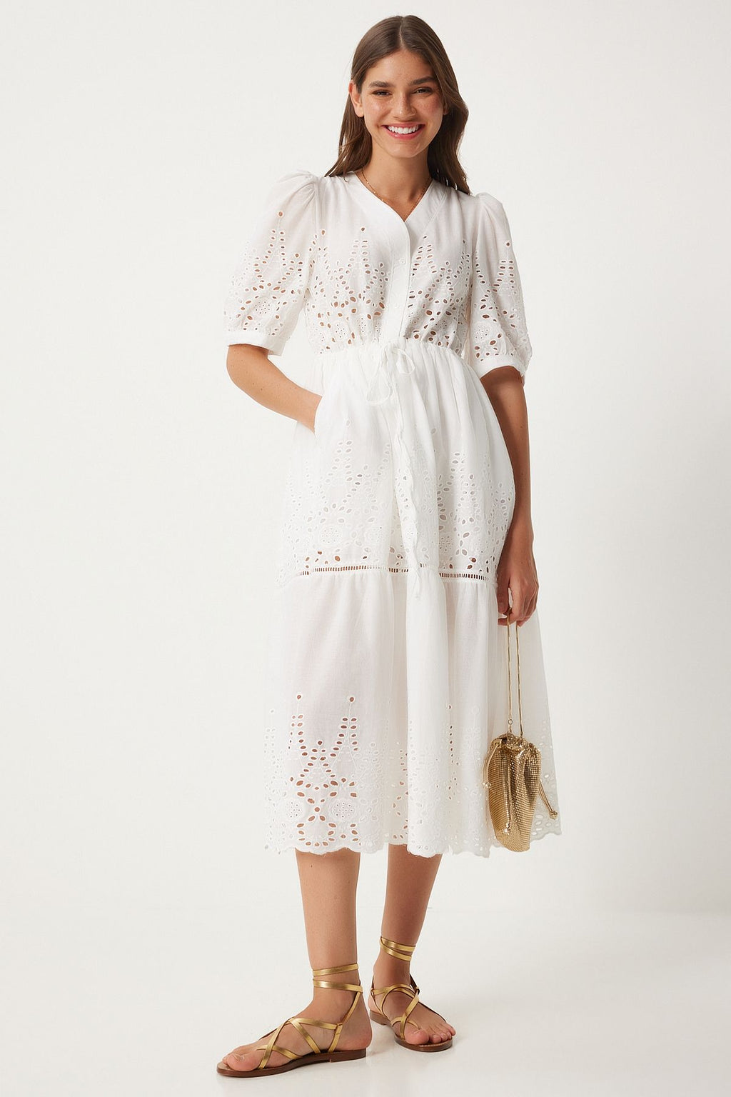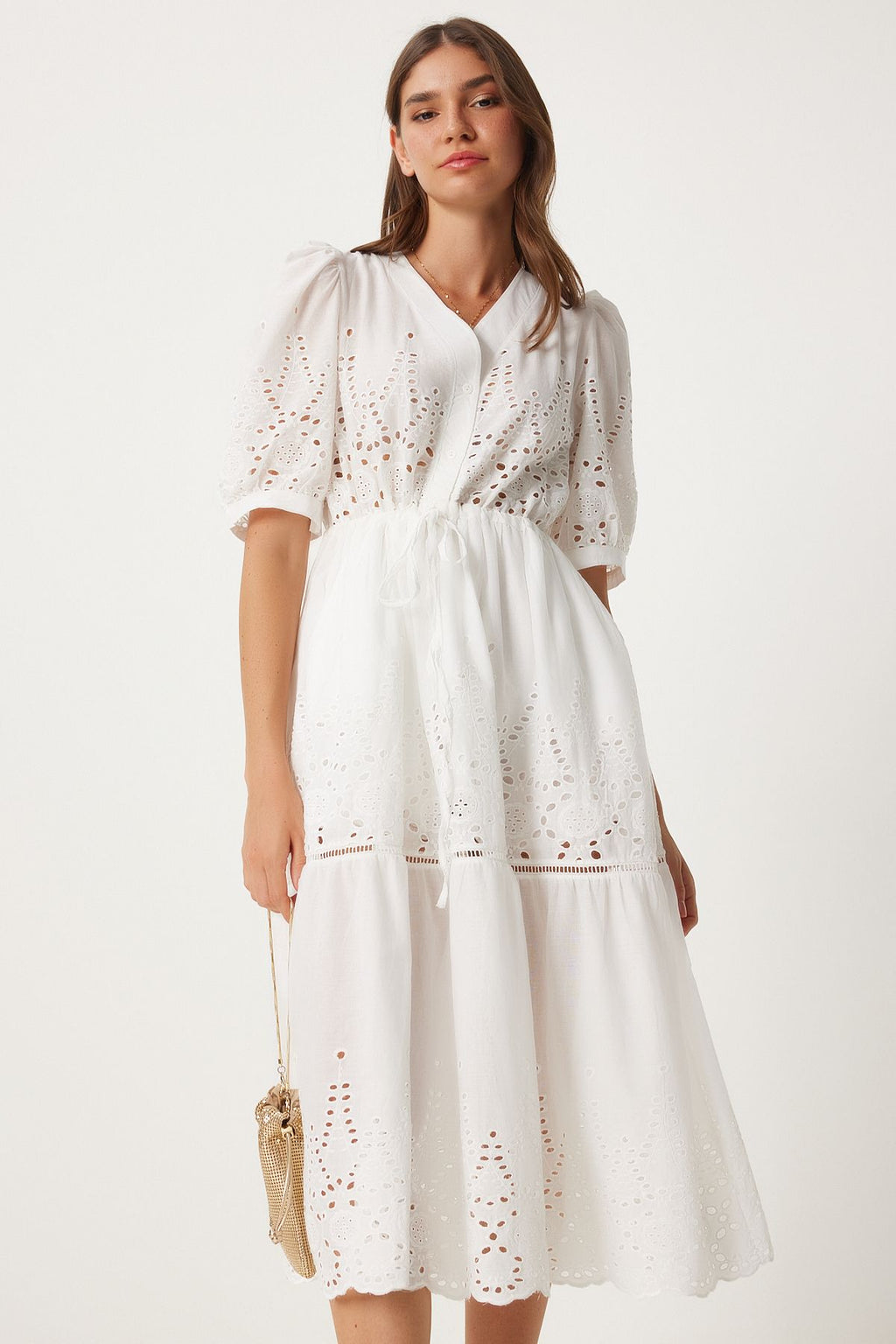Woman White V -Neck Shirred Fisto Summer Dress ES00166
