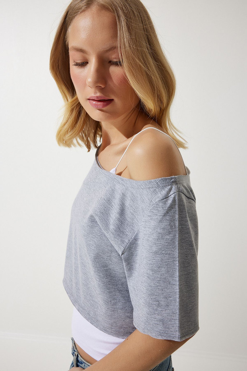 WOMEN BLACK GRAY GRAY MELANGEMENT BOAT BASIC CROP 2 PC Package Knitting T-Shirt OW00036