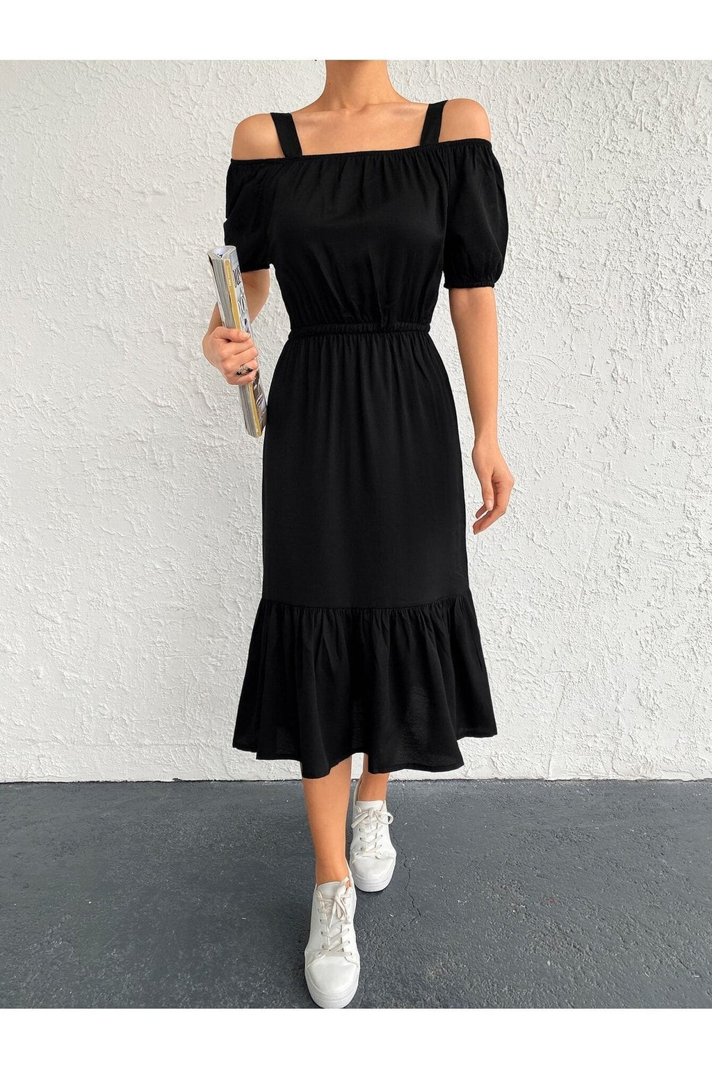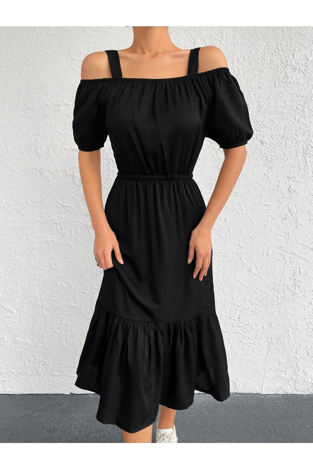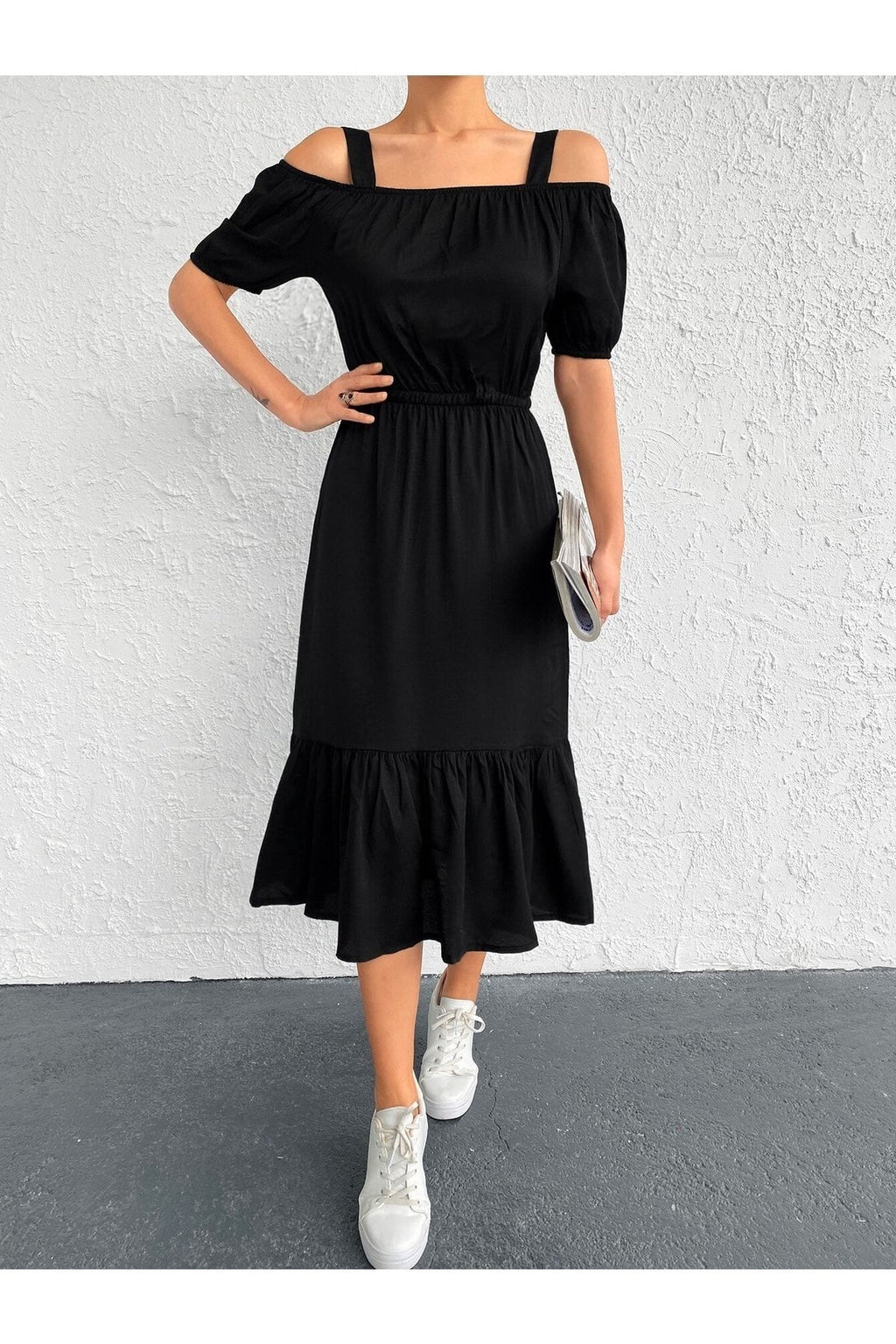 WOMEN BLACK WALL RUBLED HANDLED DRESS ARM-21K001214