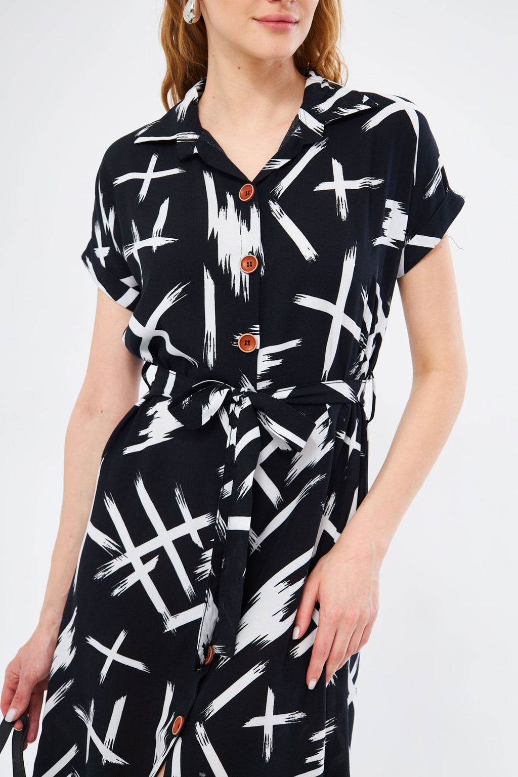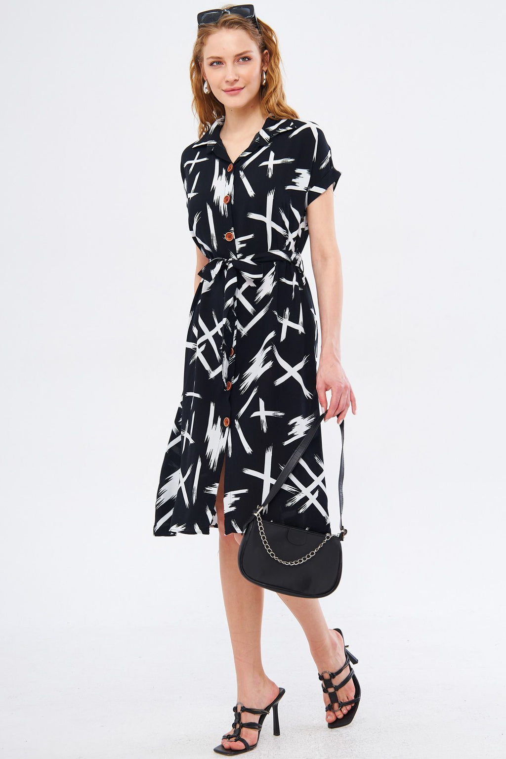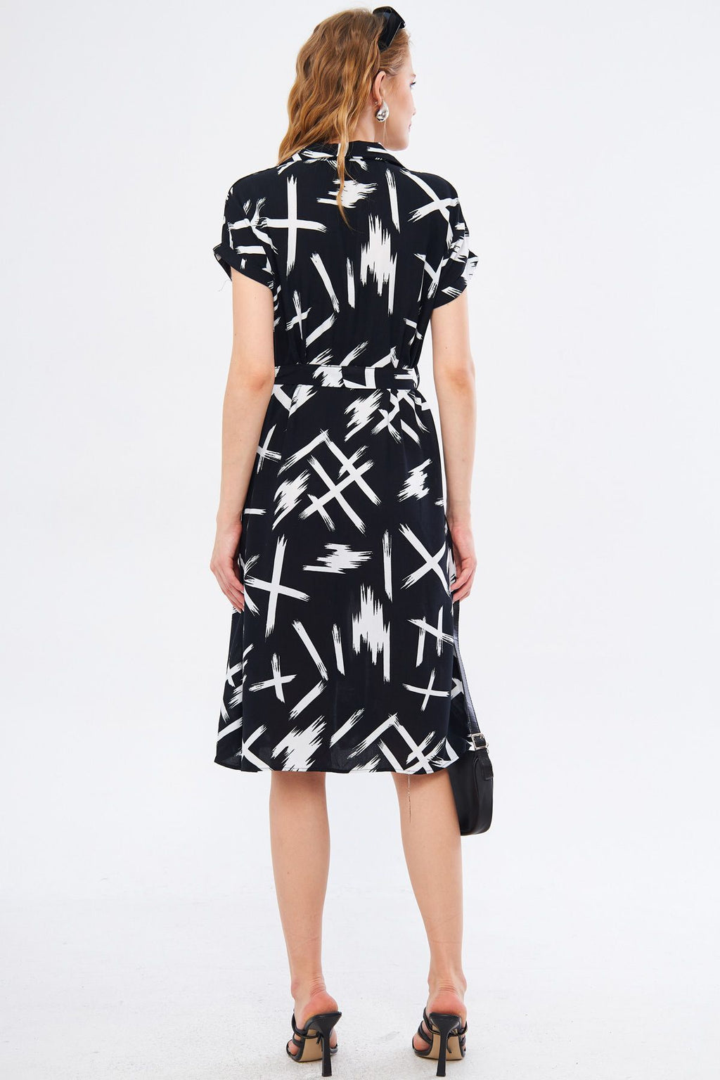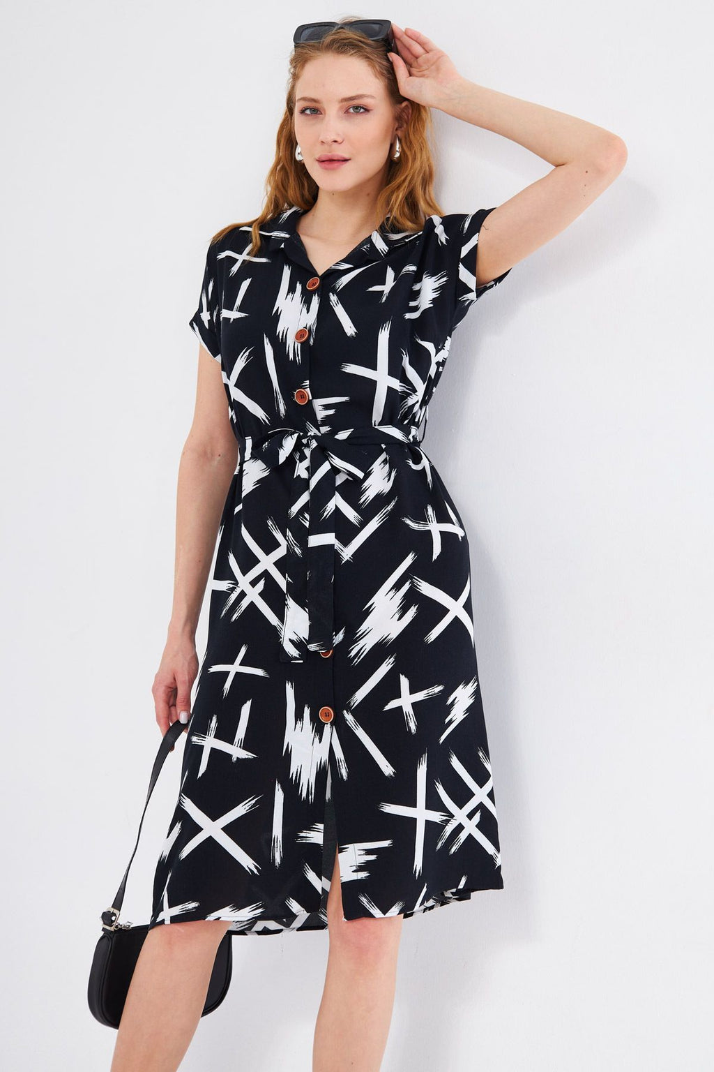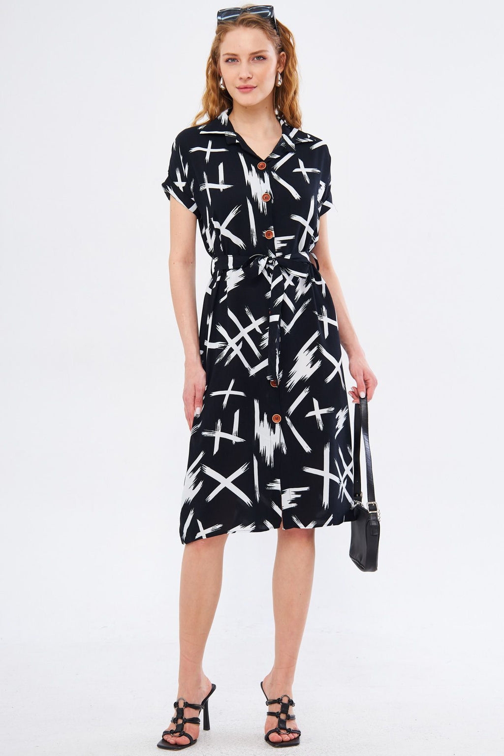 WOMEN BLACK-WHEEL LARGE FLOWER BELTED BROTHER SHORT SOLD SHOOT DRESS ARM-22Y001007