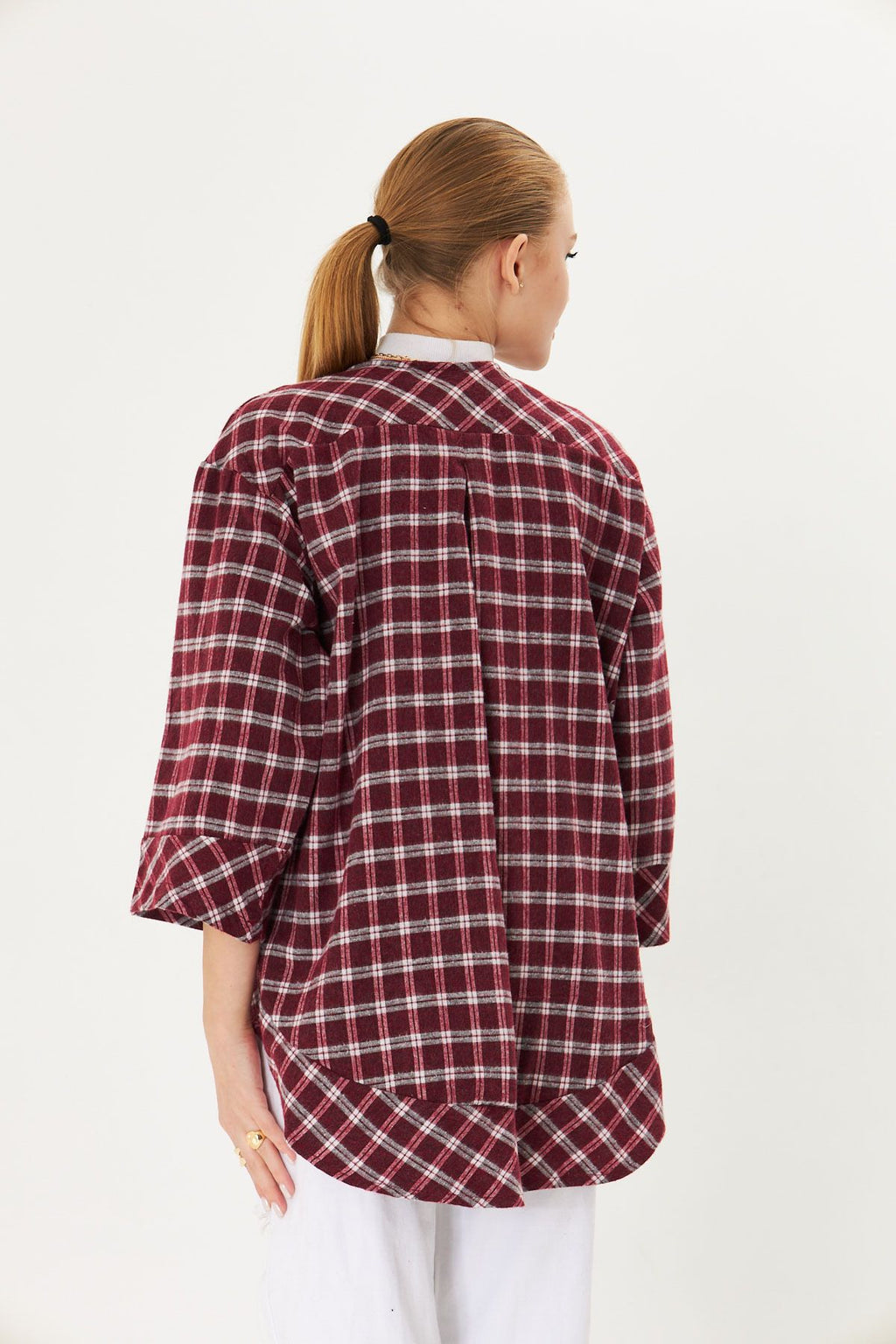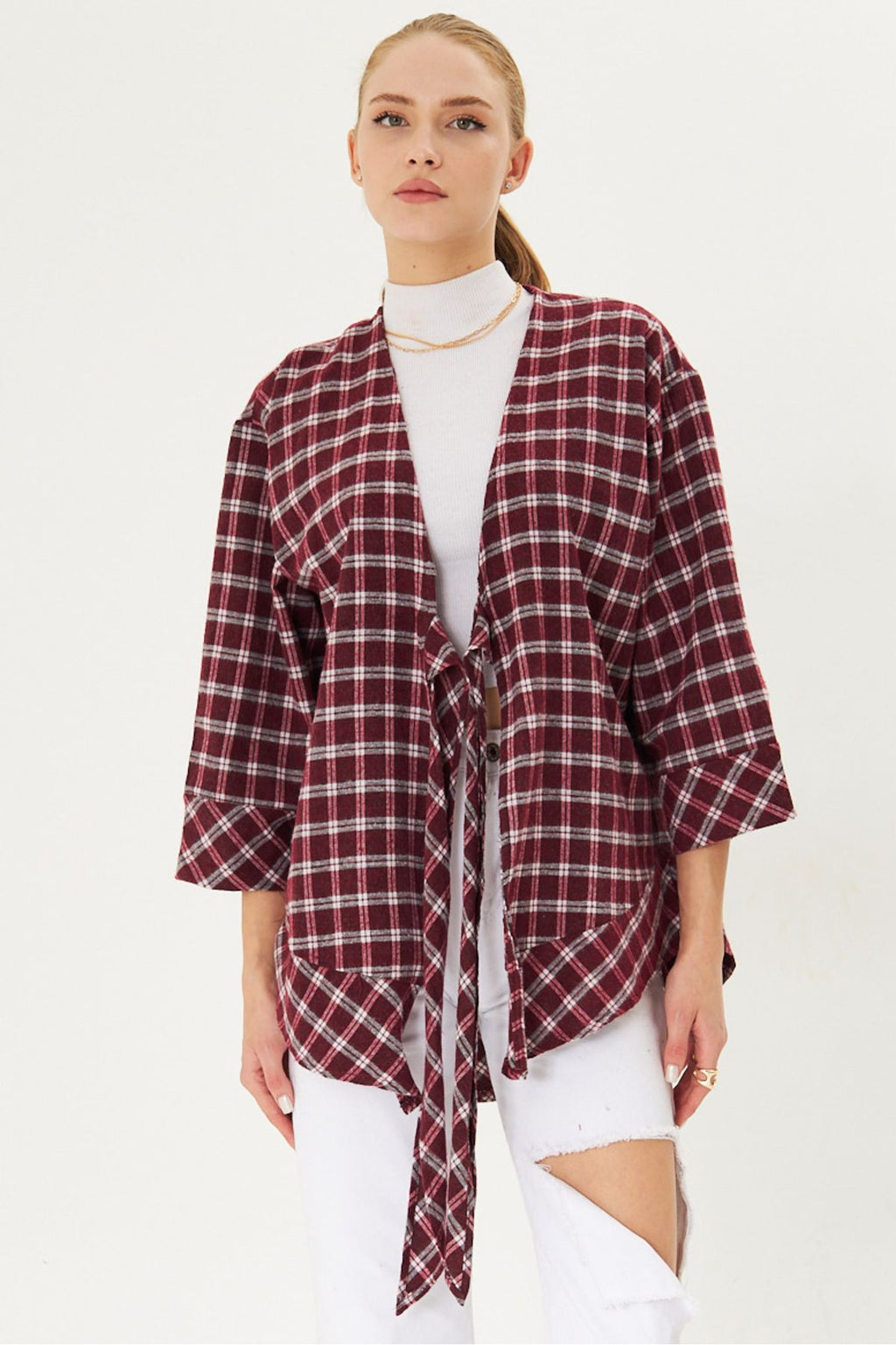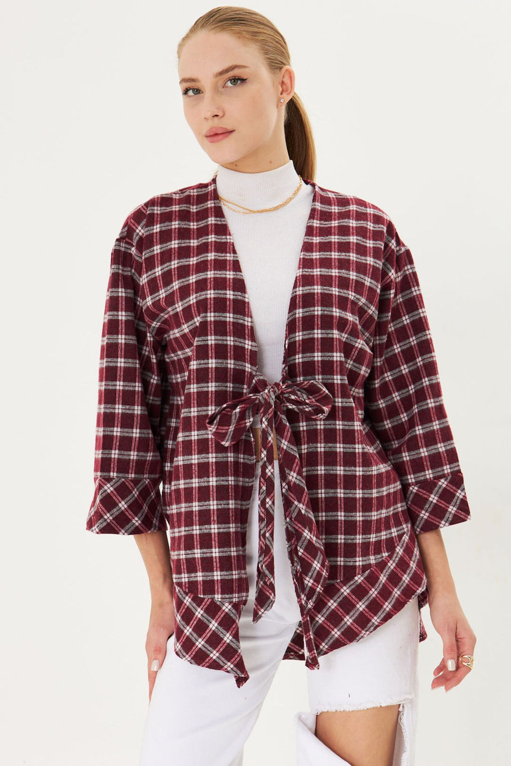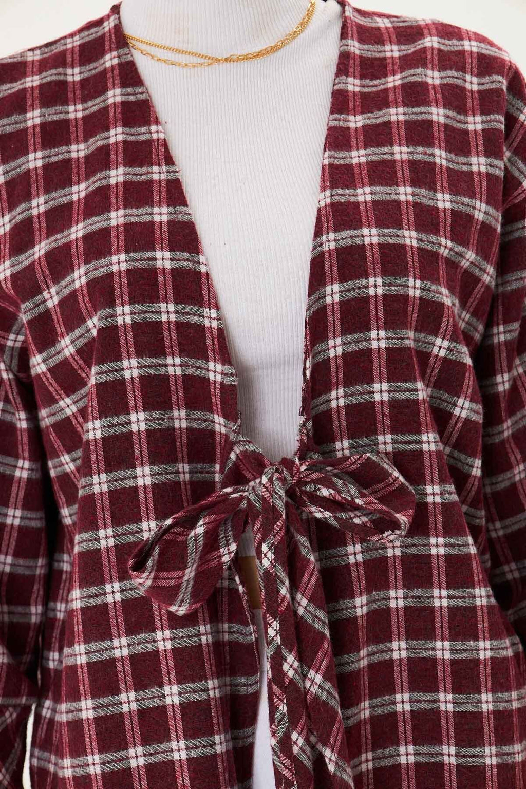 Women Bordeaux-White front connecting Eco Kimono Shirt ARM-25K001017