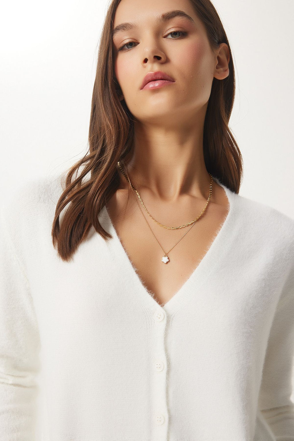 WOMEN ECRU V -Yaka Bearded Seasonal Triko Cardigan FN03446