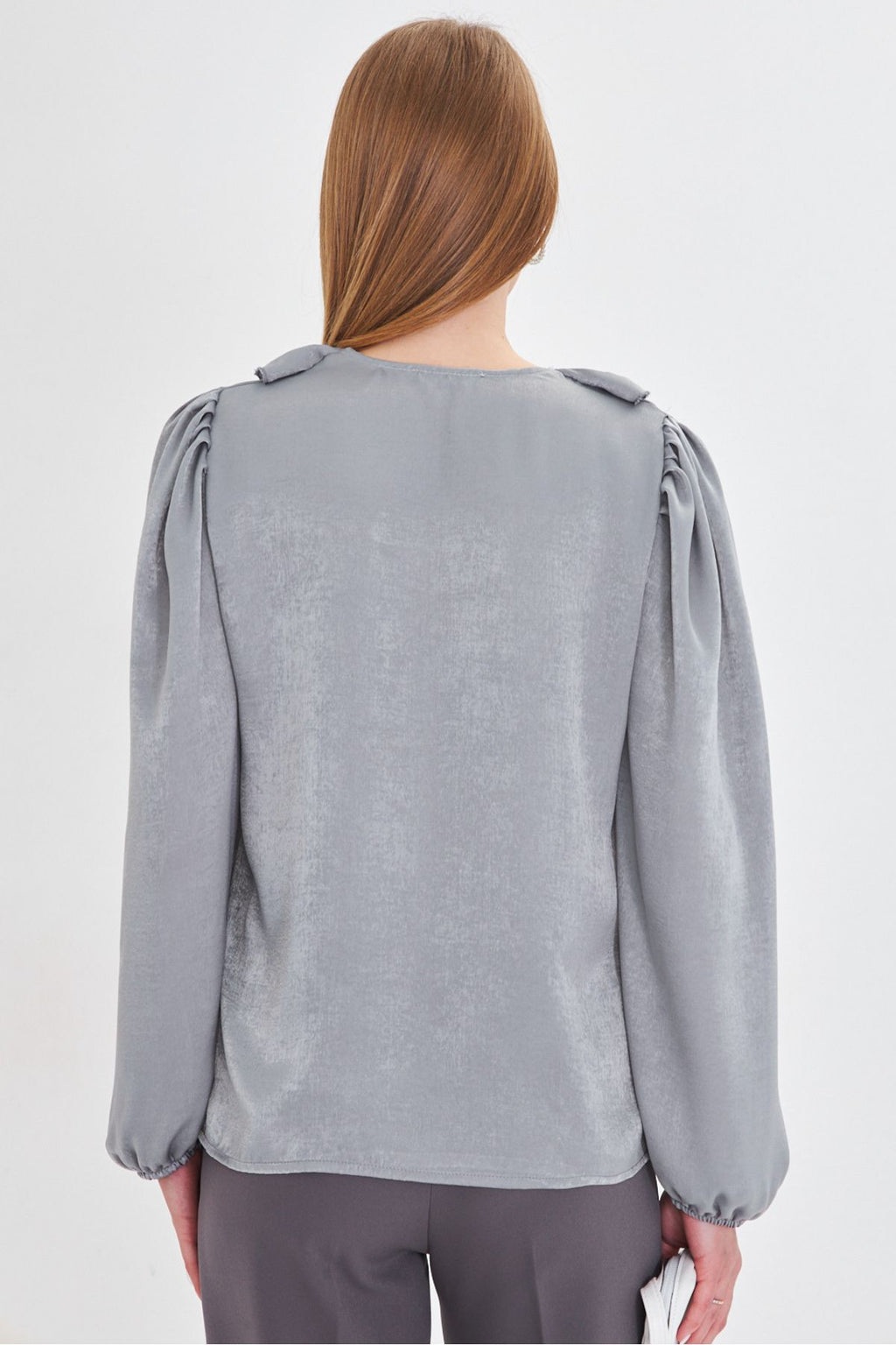 WOMEN LIGHT GRAY SIDE RISE SHOOTED HANDLED HAND RAST COTTON SATIN BLOSE ARM-22K001059