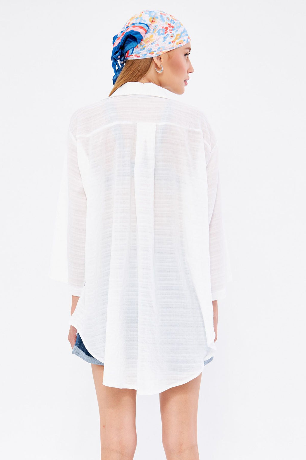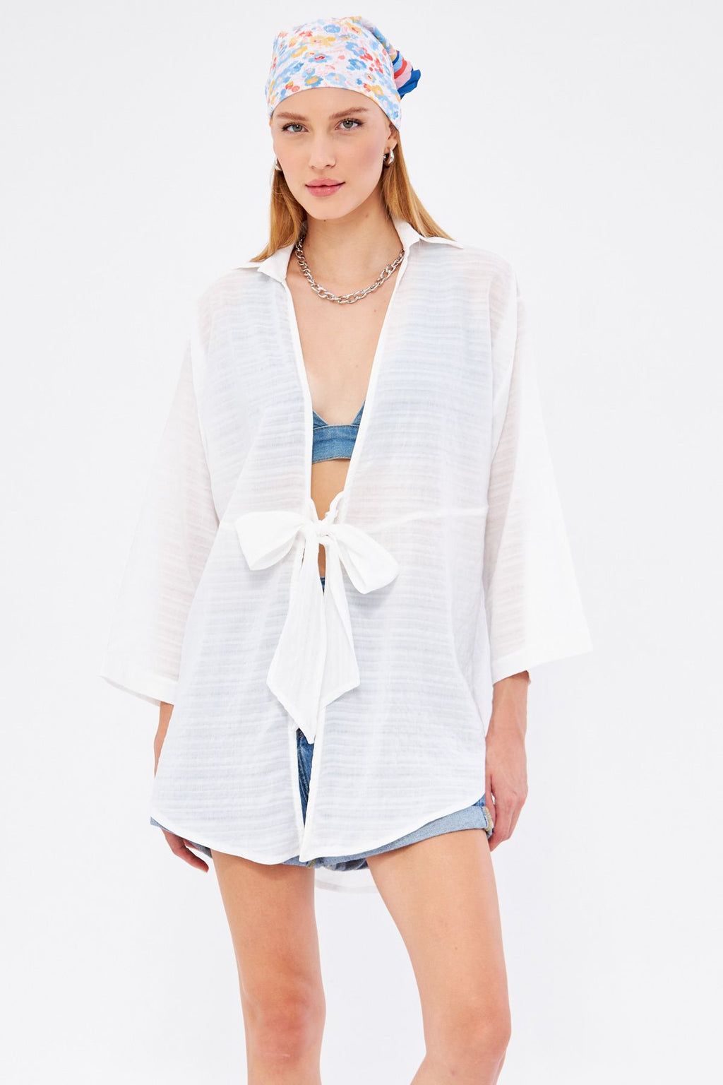 WOMEN WHITE Self-striped front-binding kimono shirt ARM-24Y001101