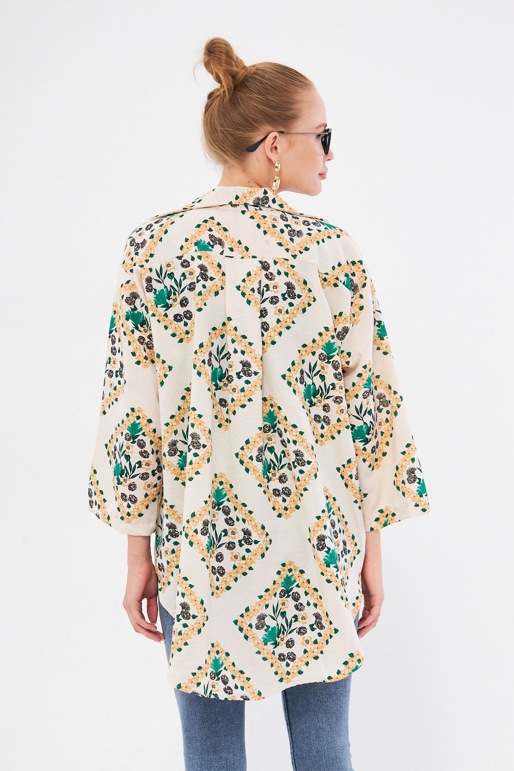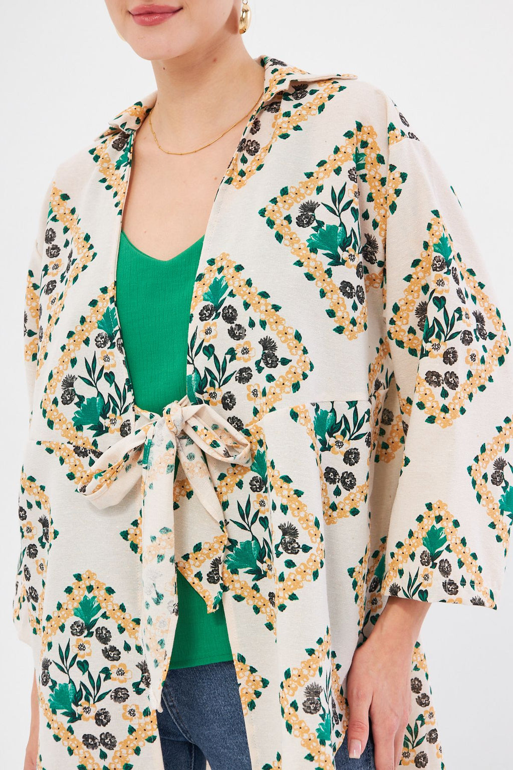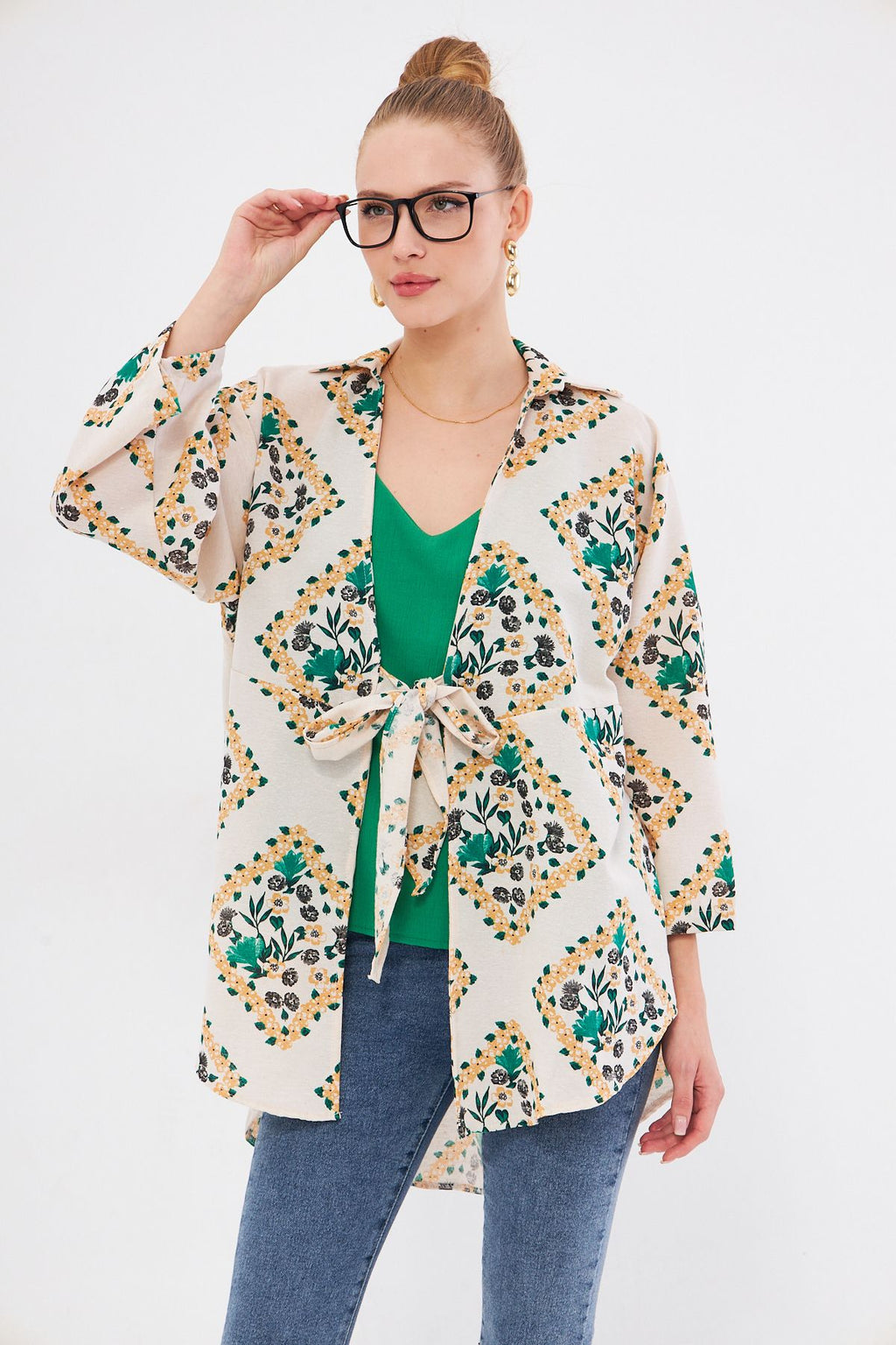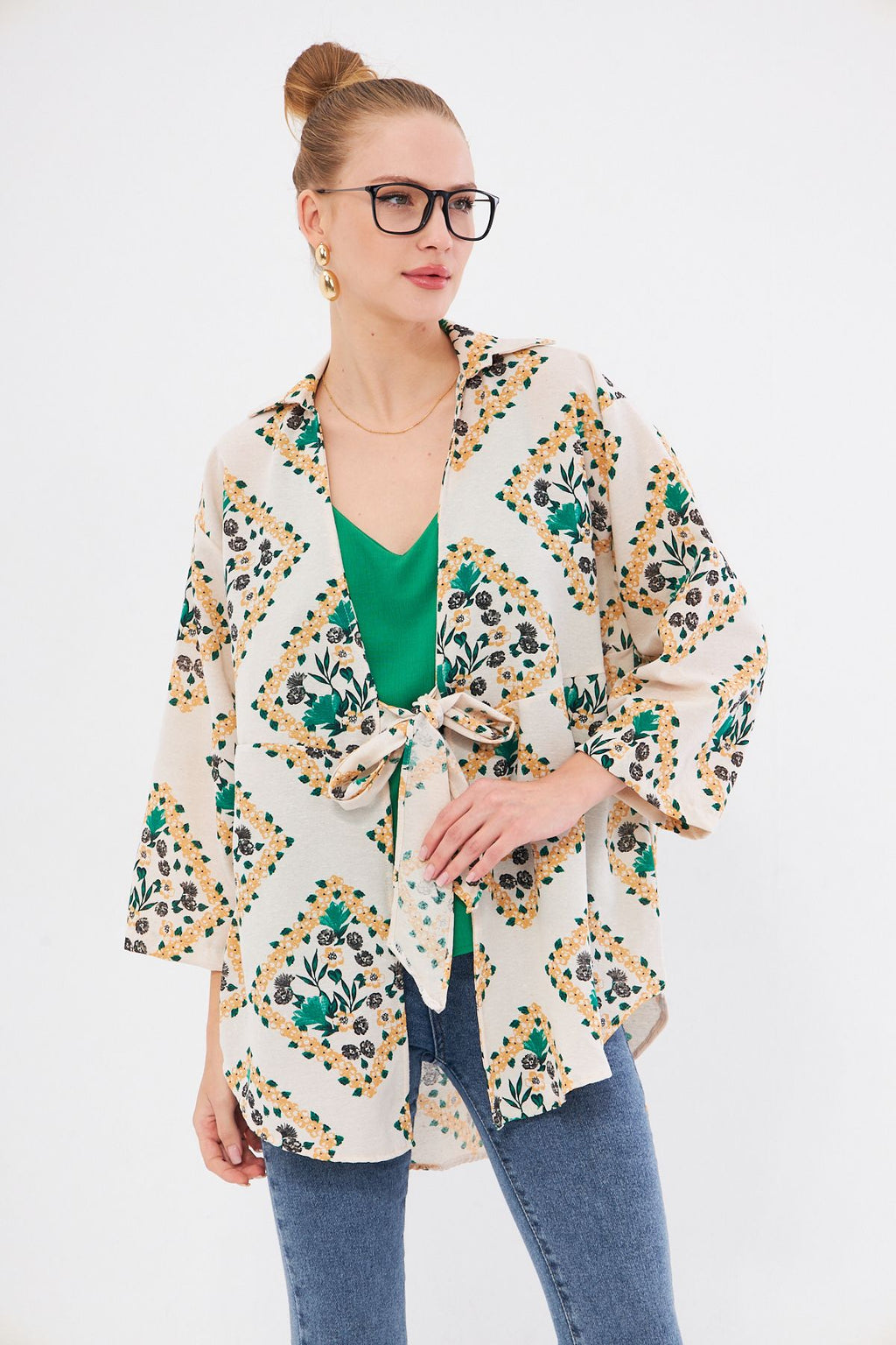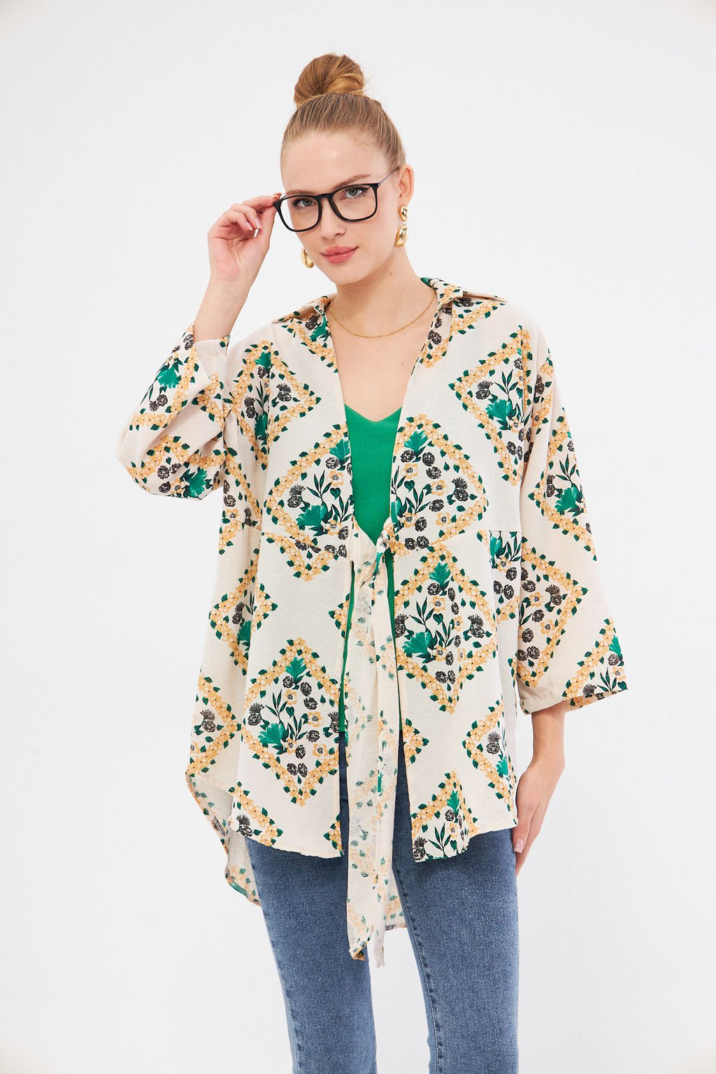 Women with light green patterned front connecting kimono shirt ARM-24Y001080