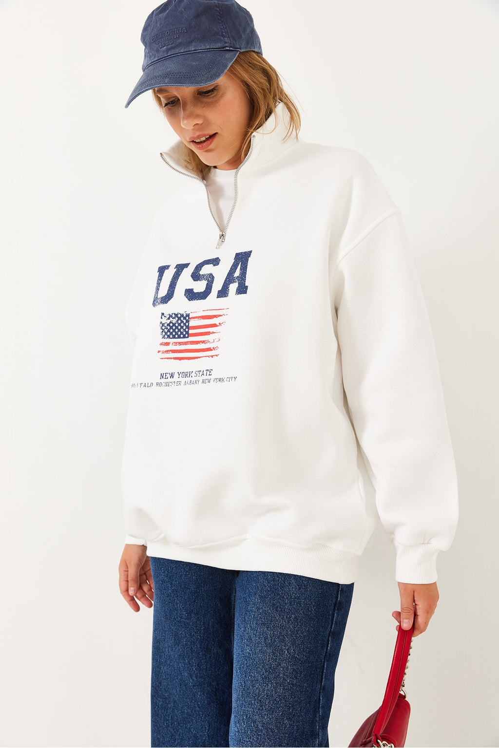 Women's Bee Zippered USA Printed High Collar Sweatshirt 60251880