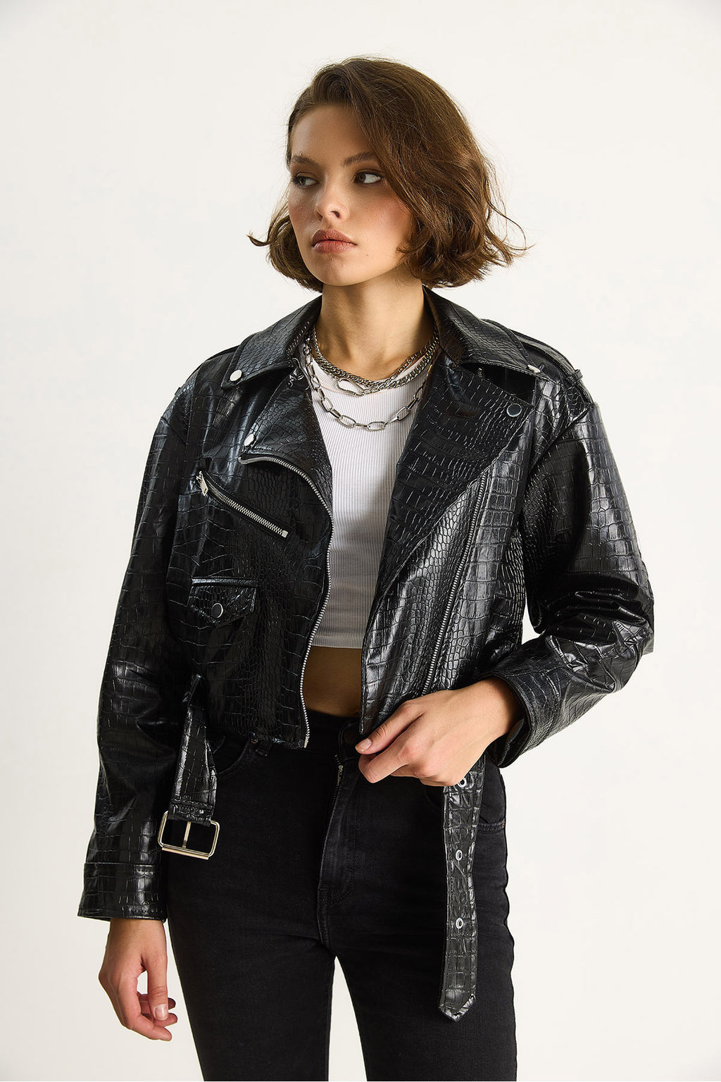 Women's Belted Crocodile Crop Faux Leather Jacket 3131 60284105