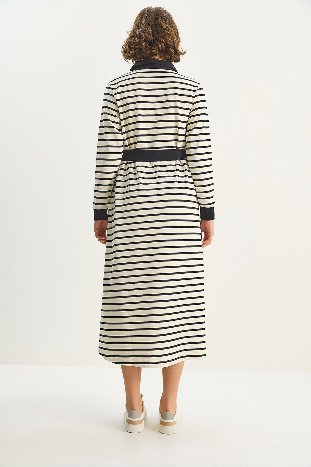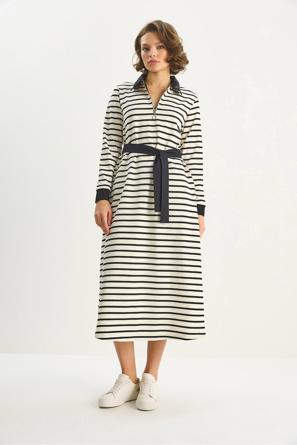 Women's Belted Pocket Detailed Striped Long Basic Dress with Zipper Collar 8514 60283659