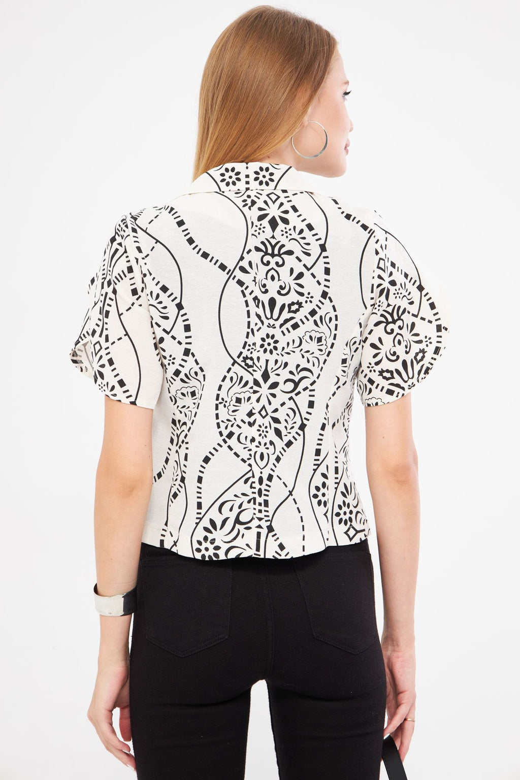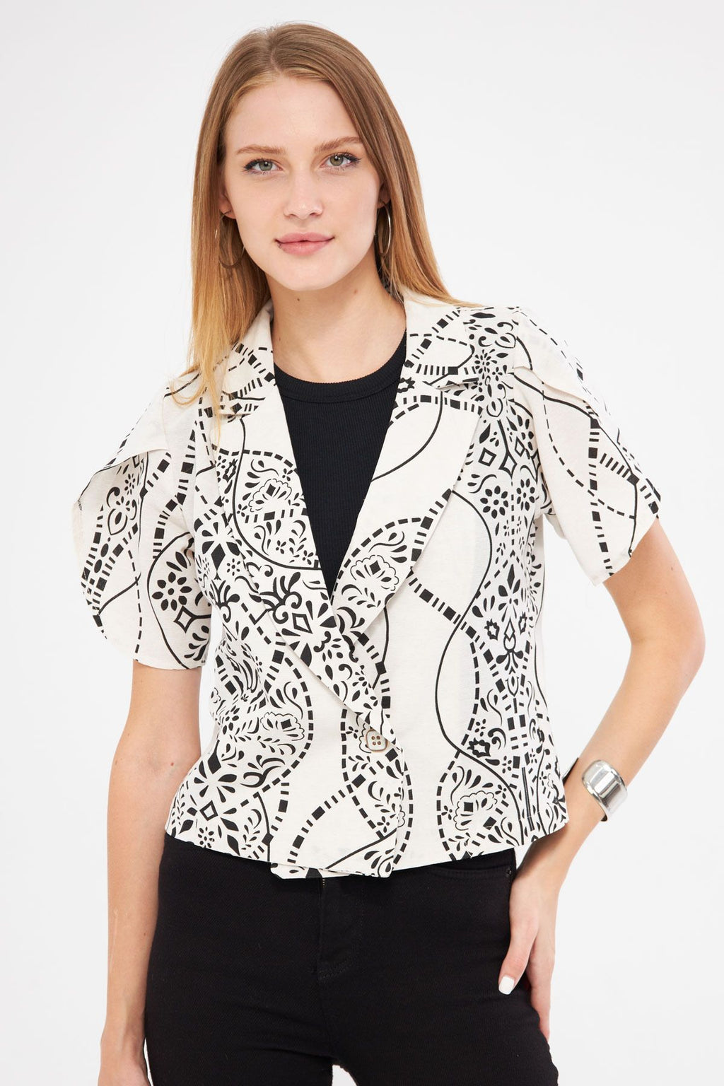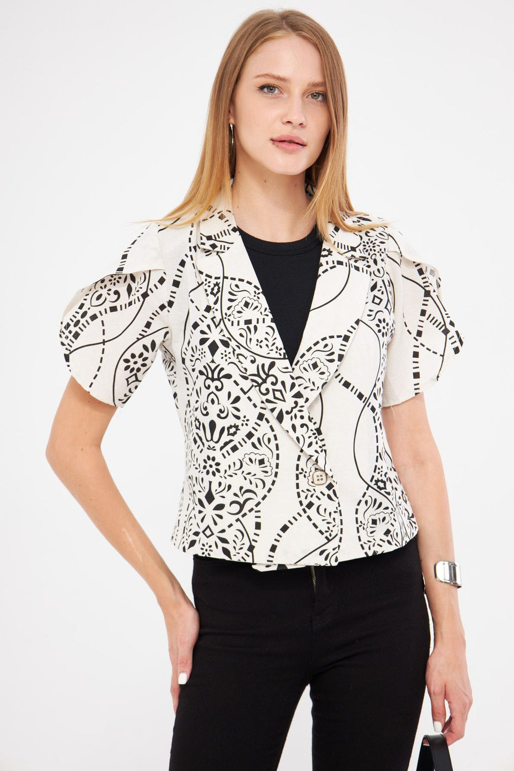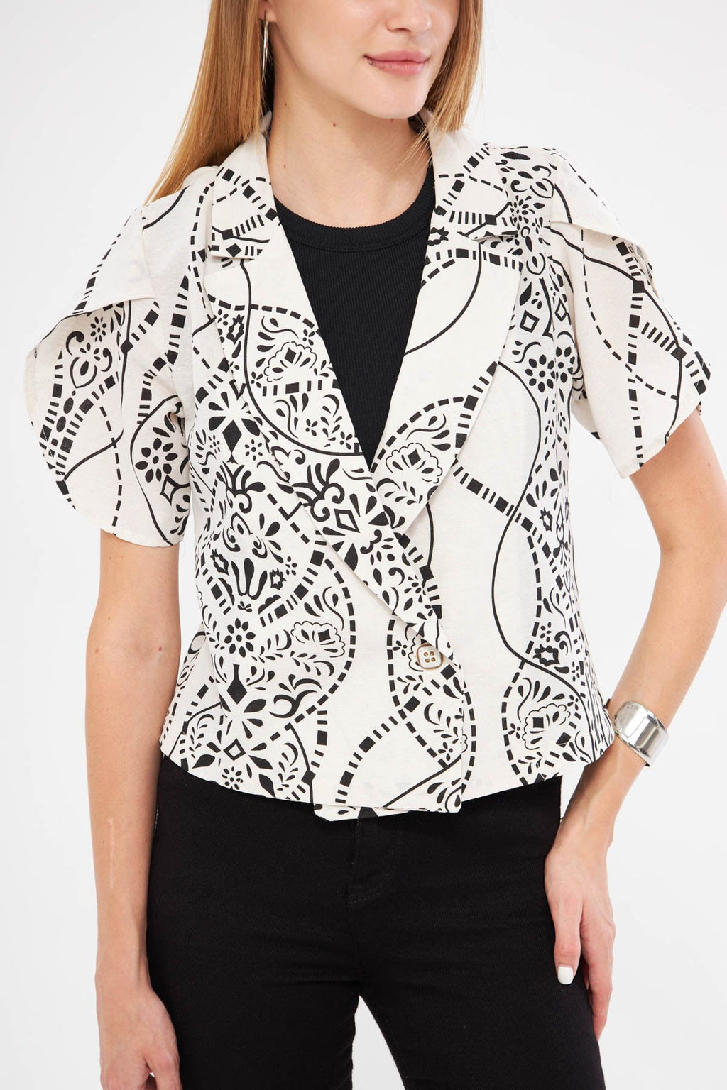 Women's black-and-white linen-looking patterned handle slit Crop Short Sleeve Jacket ARM-24Y001095