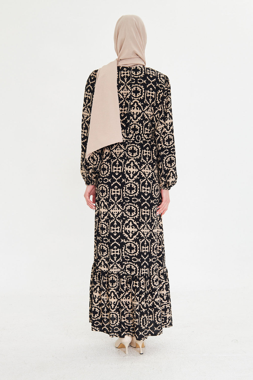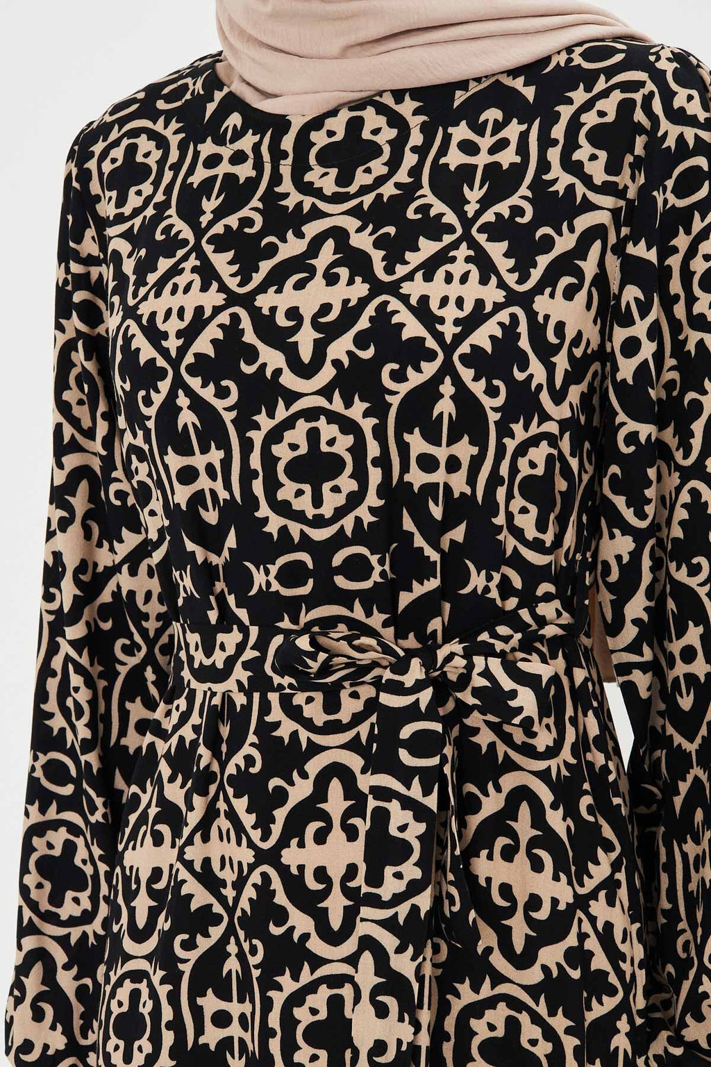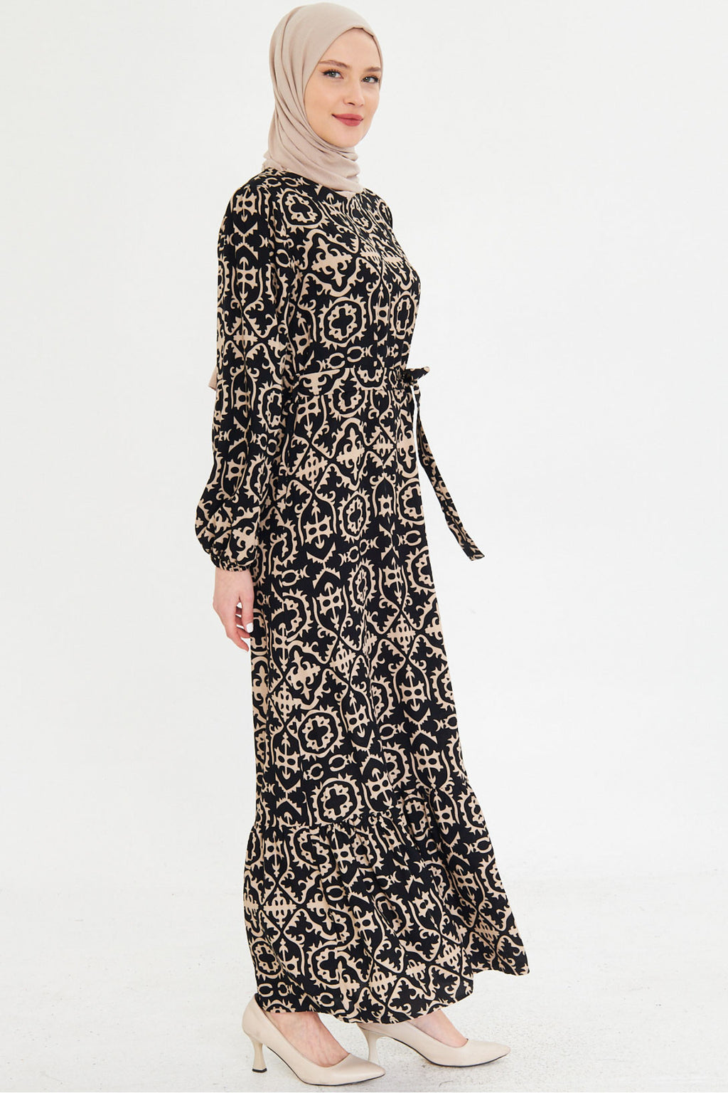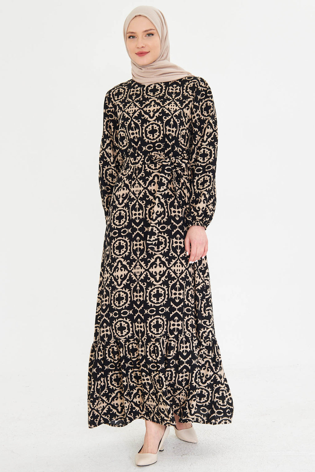 Women's Black-Beige Crew Neck Back Zipper Skirt Frilly Belted Long Hijab Dress ARM-25K001101
