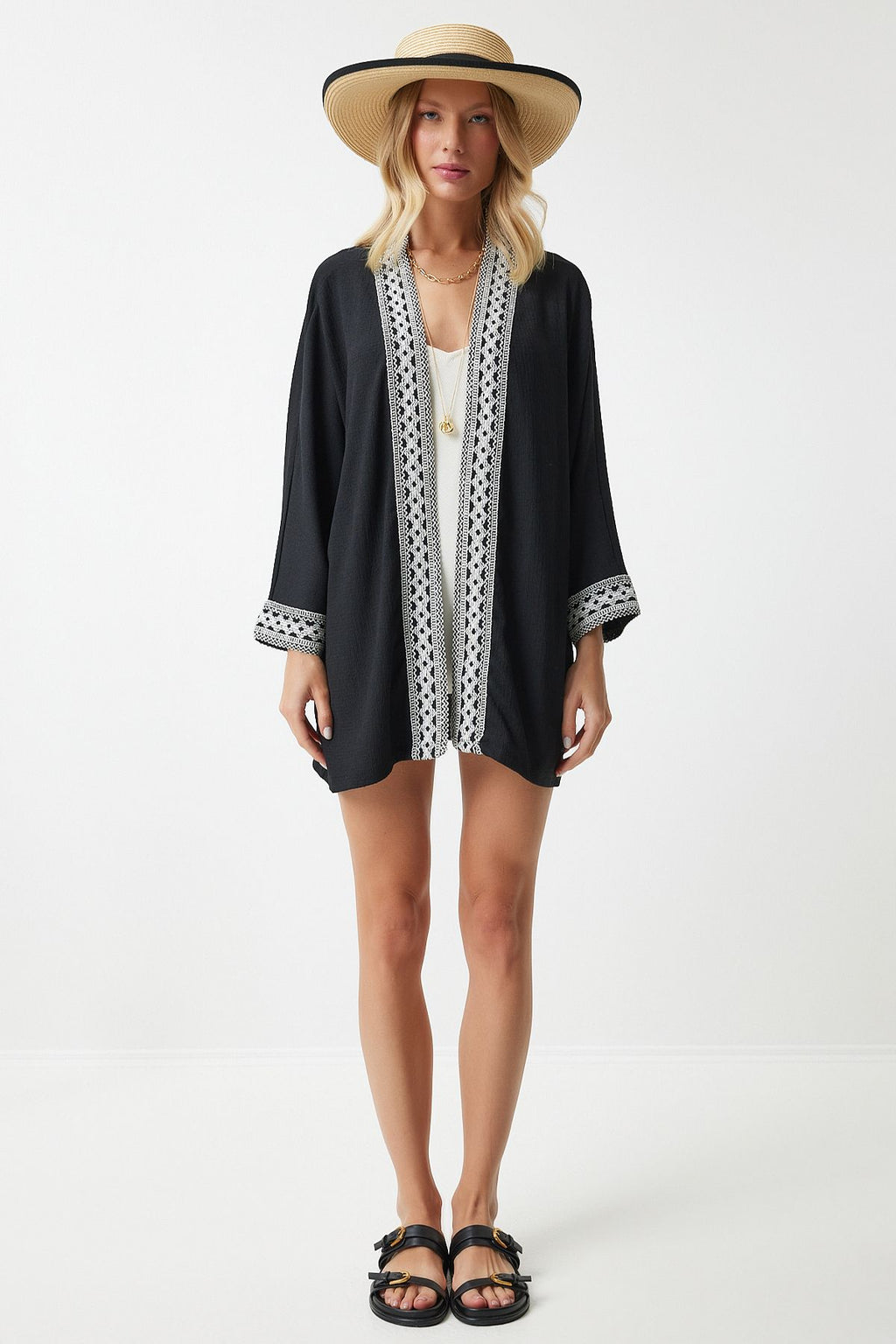 Women's Black Embroidery Krinkıl Kimono DD01101