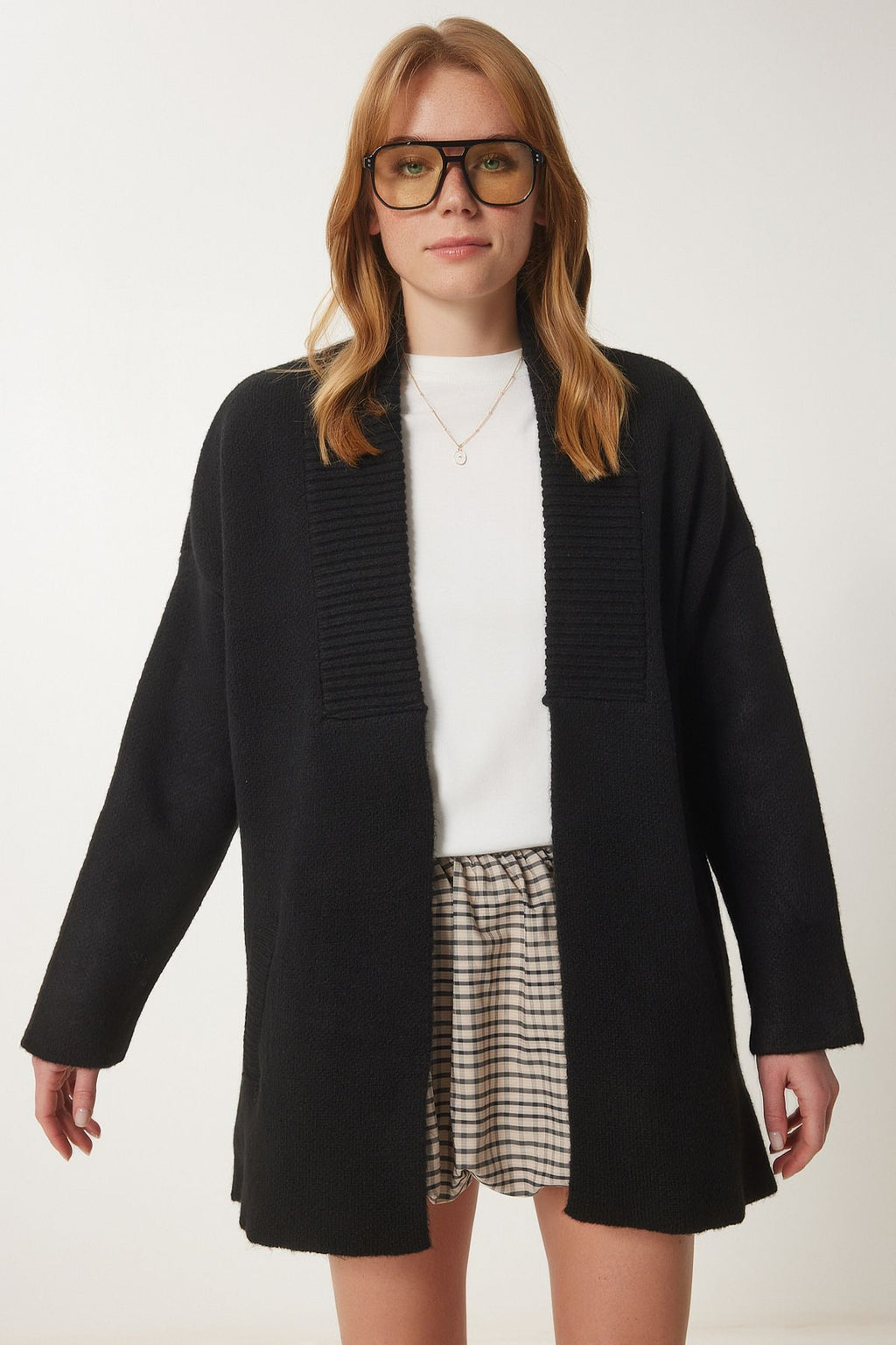 Women's black pocket thick textured knitwear cardigan PF00063