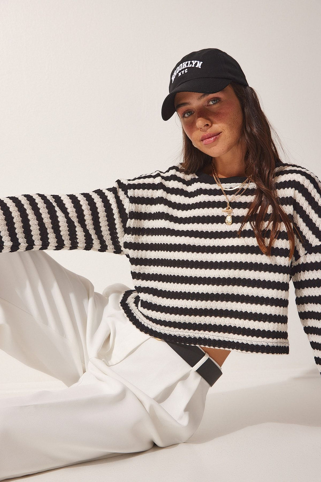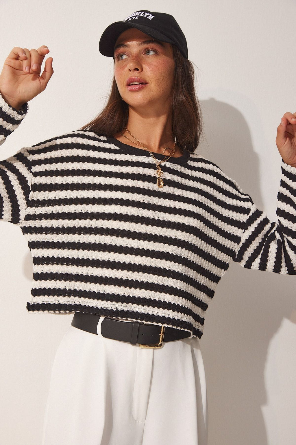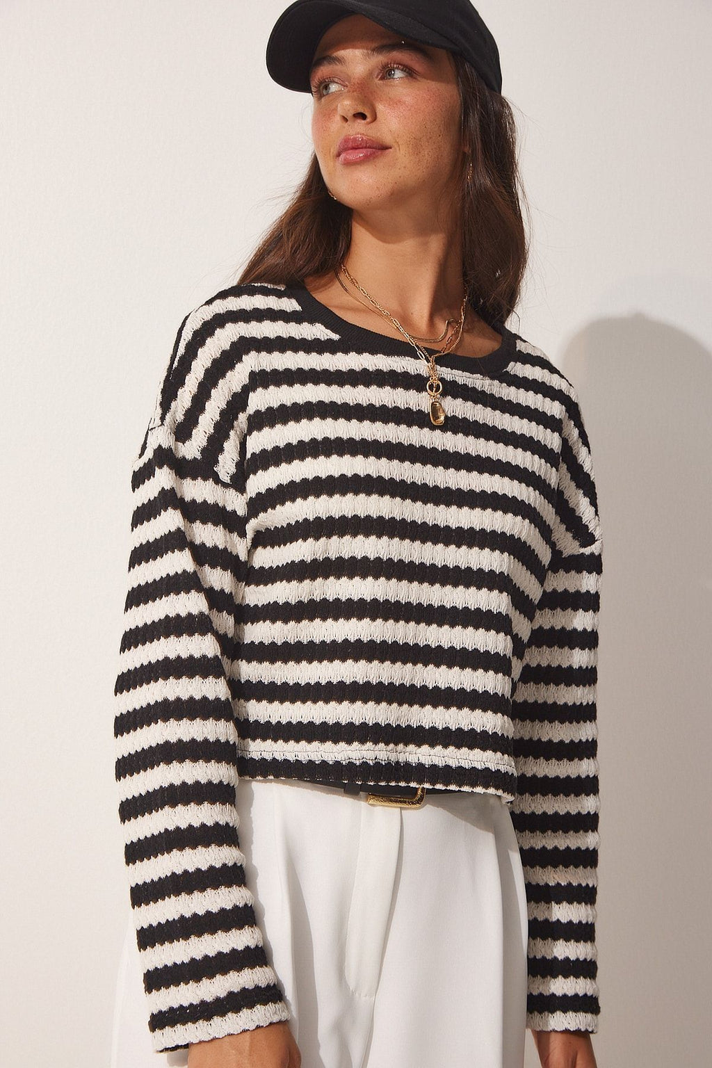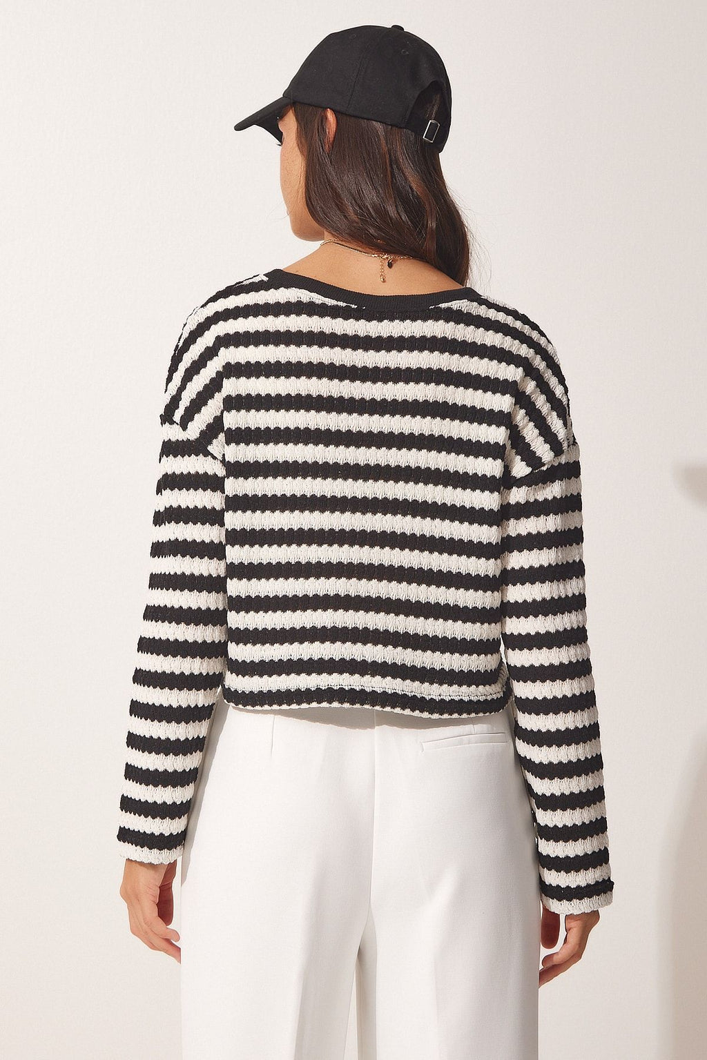 Women's black striped crochet knitwear sweater ub00123
