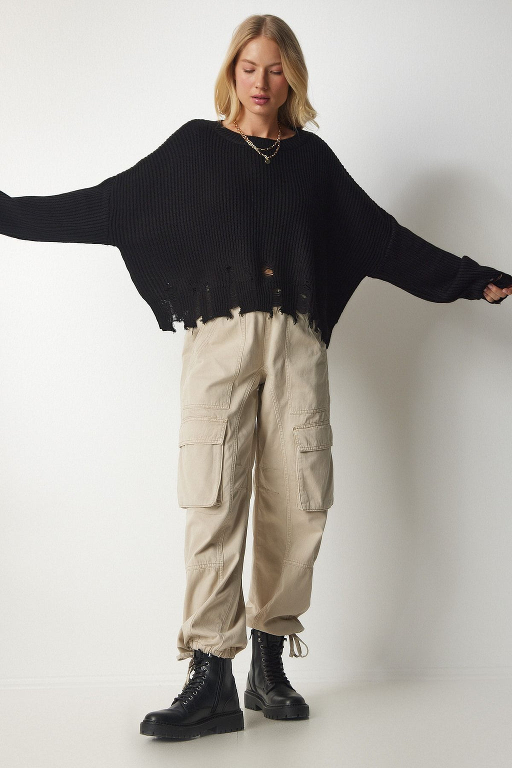 Women's black tear detailed overwhelm knitwear sweater ki00098