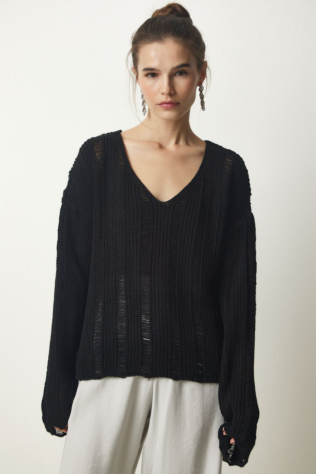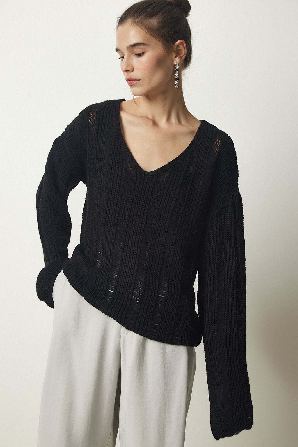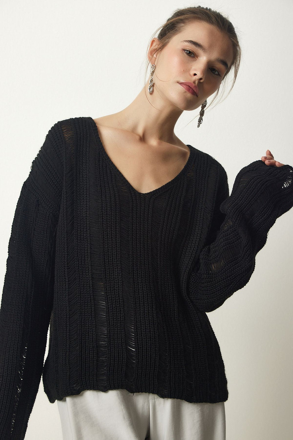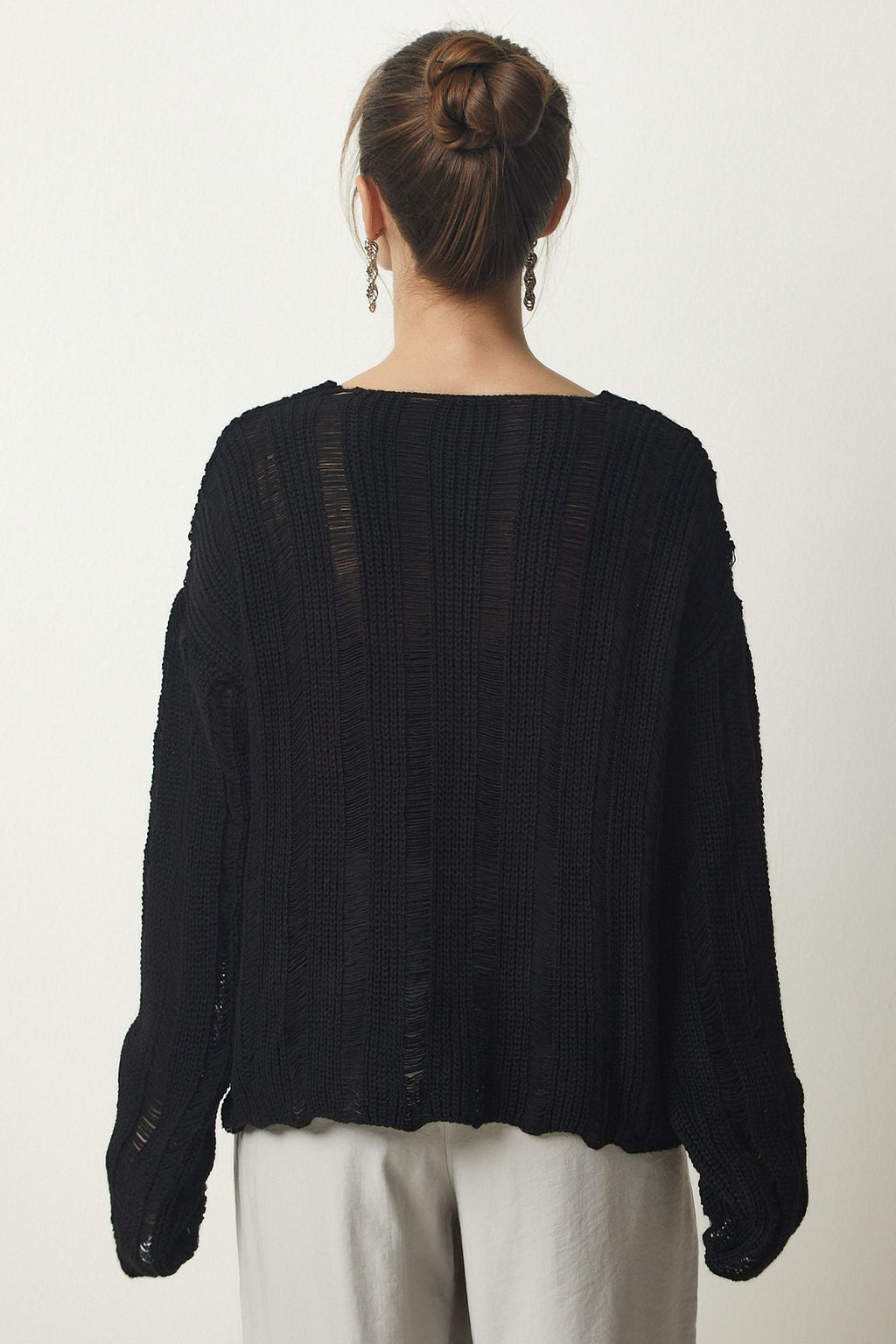Women's black tear detailed overwhelm knitwear sweater ki00105