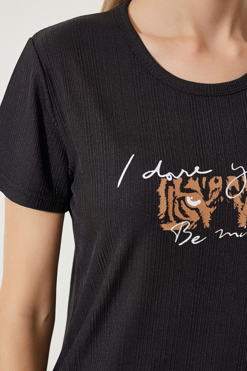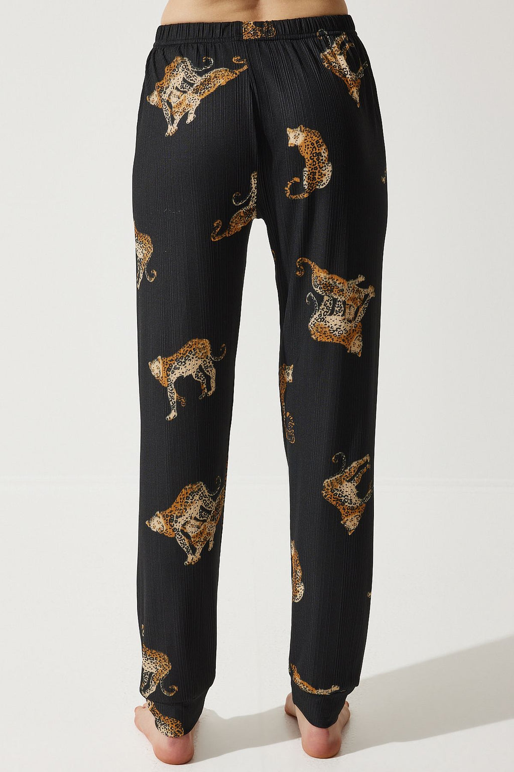 Women's black tiger patterned buckle t-shirt pants knitting pajama set FP00004
