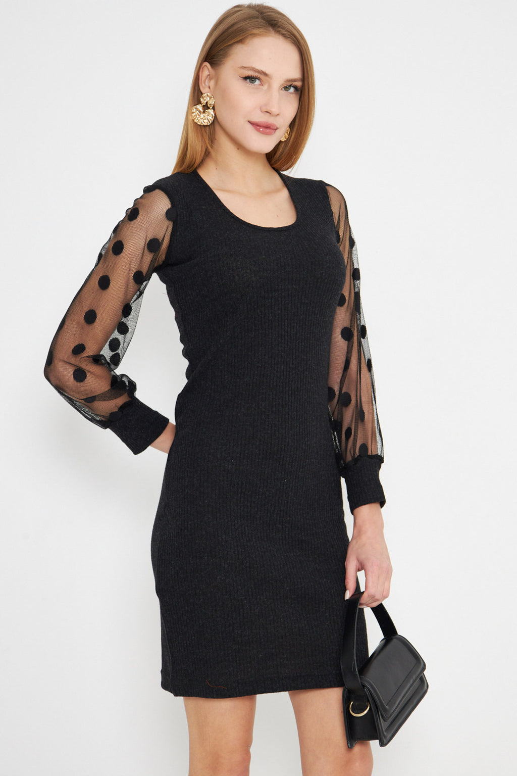 Women's Black U-Neck Fitted Sleeves Tulle Detailed Camisole Knitwear Dress ARM-25K001068