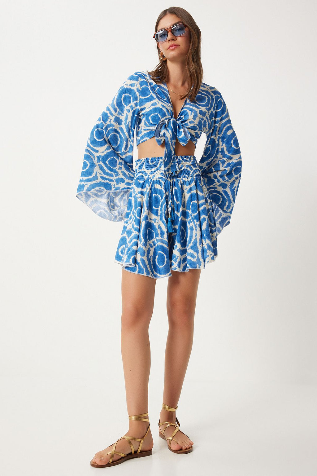 Women's Blue Cream Patterned Blouse Short Set DK00171