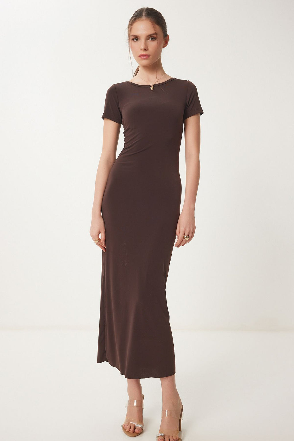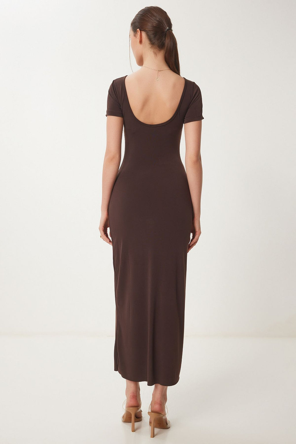 Women's Brown Back Décollette Long Sandy Knitting Dress DZ00115