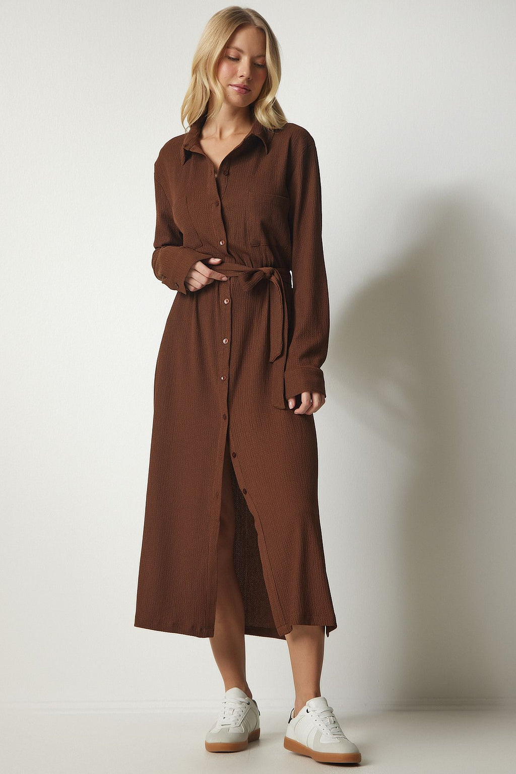 Women's brown belt long shirt dress ub00187