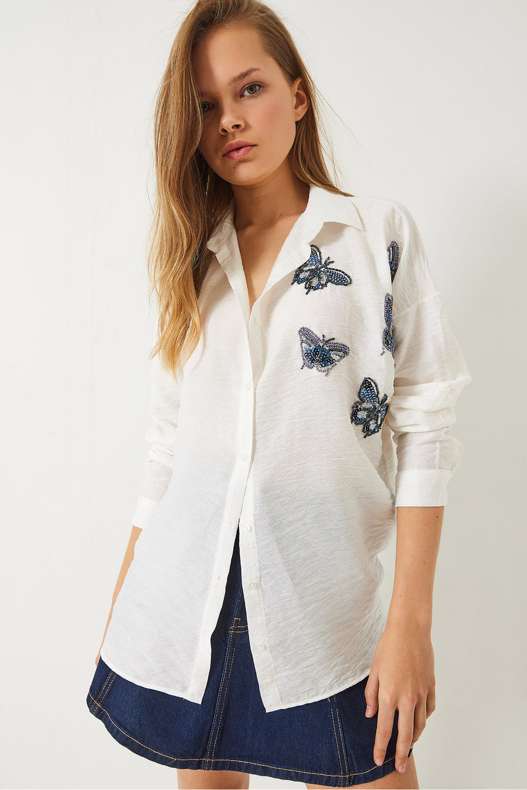 Women's Butterfly Bead Stone Embroidered Aerobin Oversize Shirt 60283030