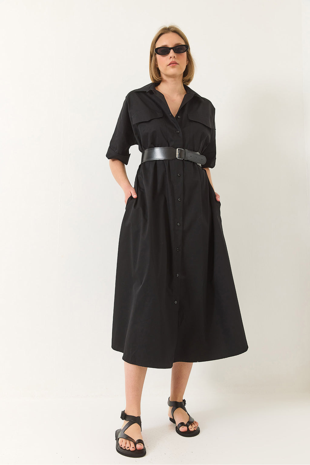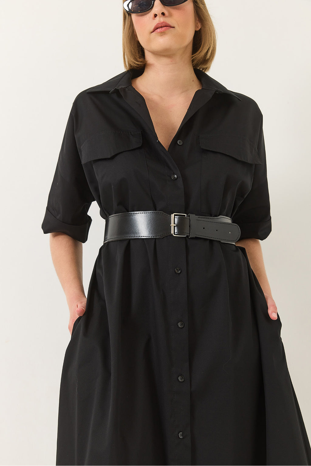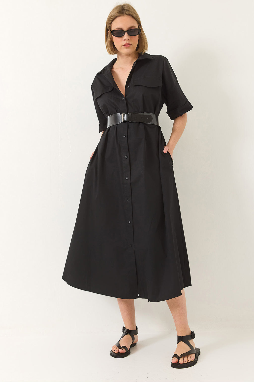 Women's Button Closure Pocket Detailed Belted Poplin Shirt Dress 60283191