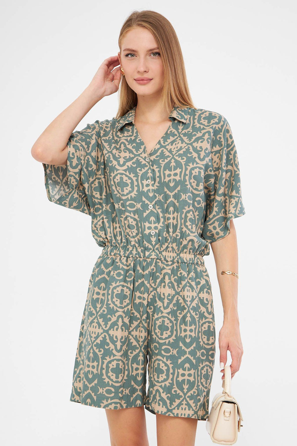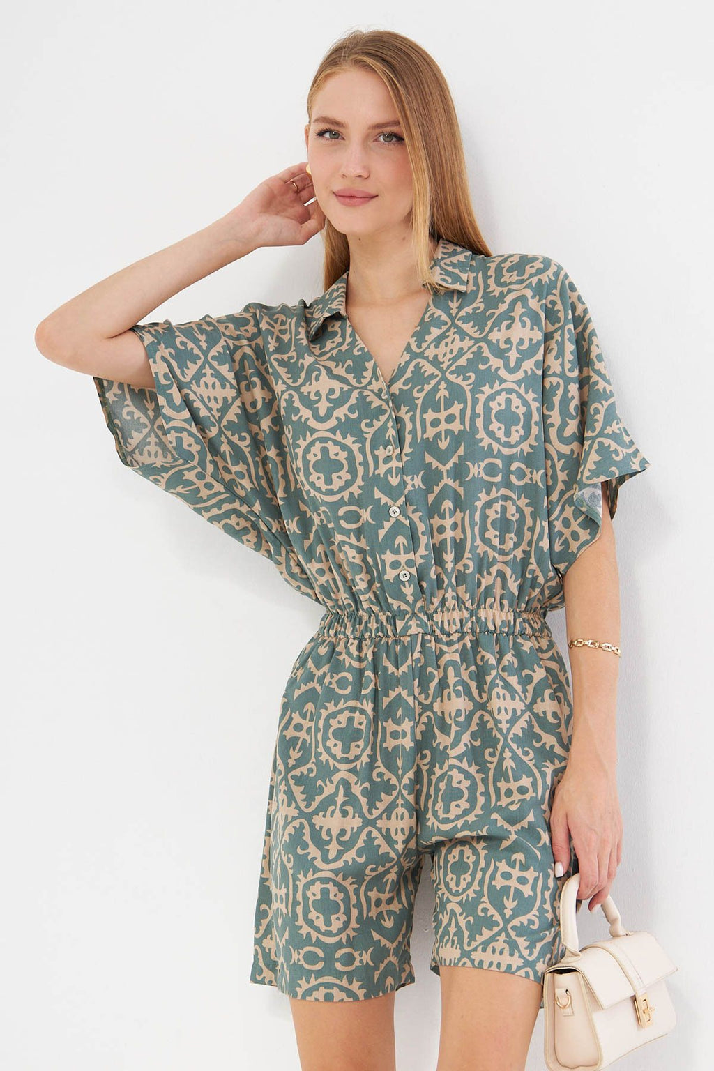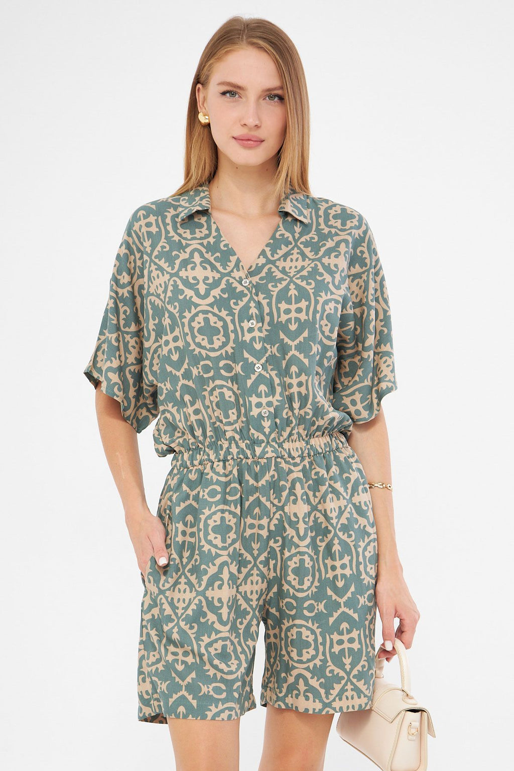 Women's Cagla Green Shirt Cep Patterned Short Tulum ARM-24Y001023