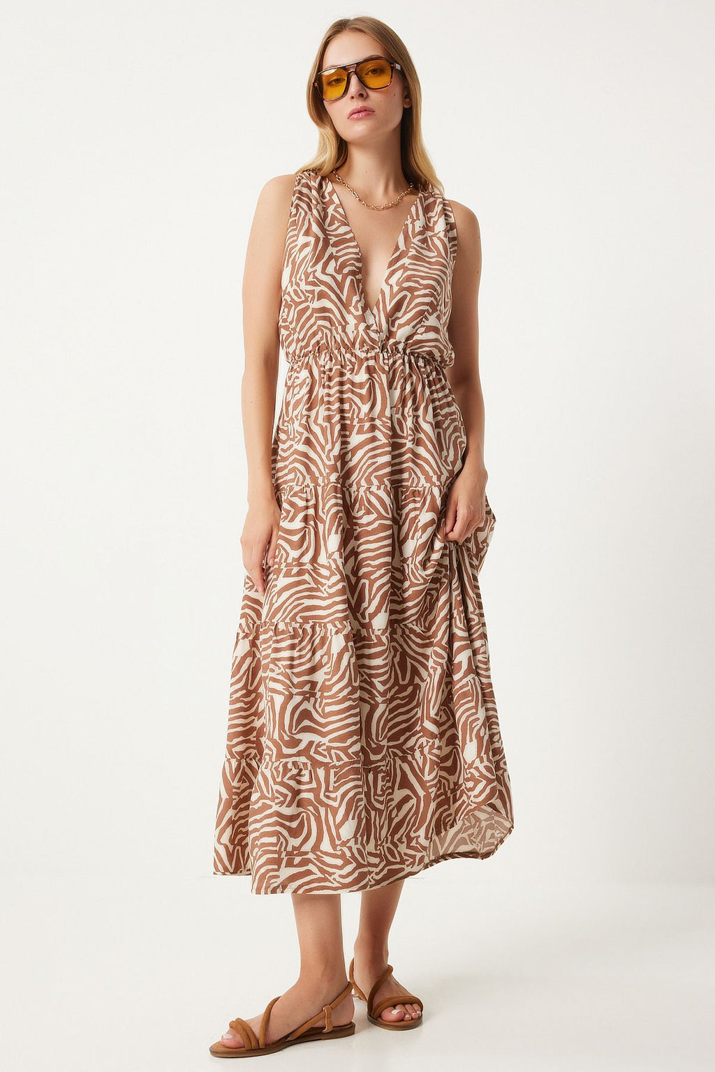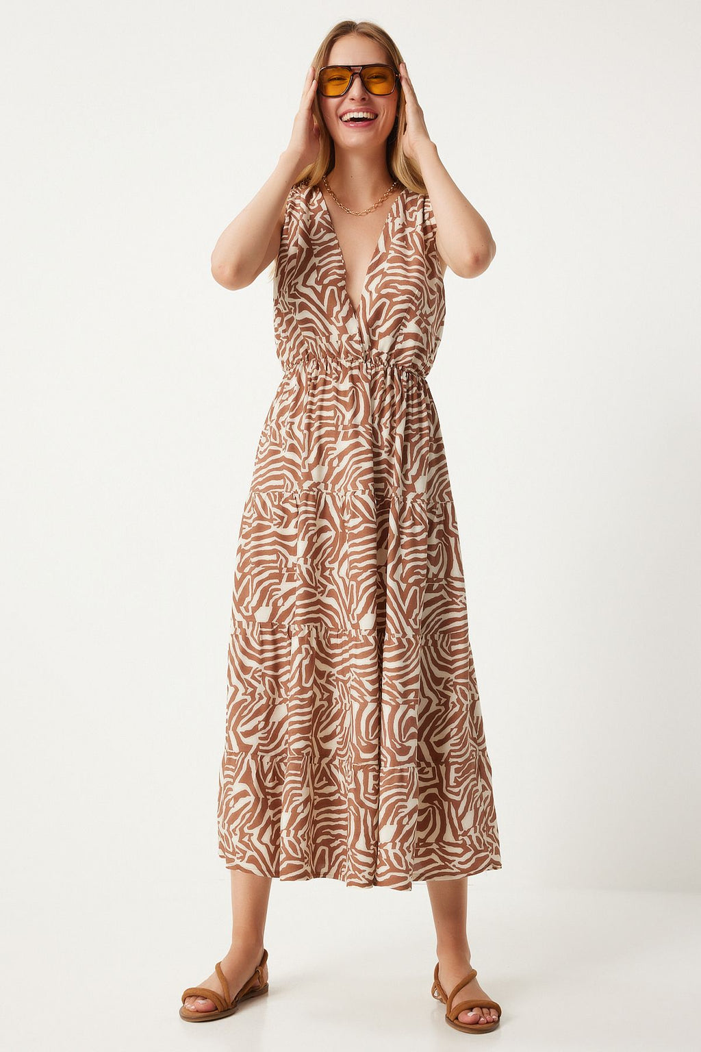 Women's Cream Brown Pattern V -neck Summer Viscose Dress CI00110