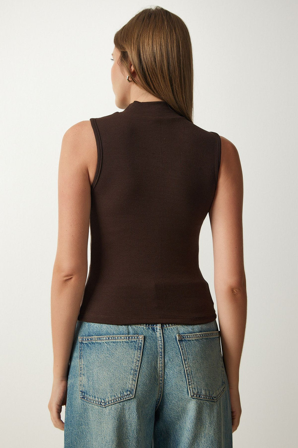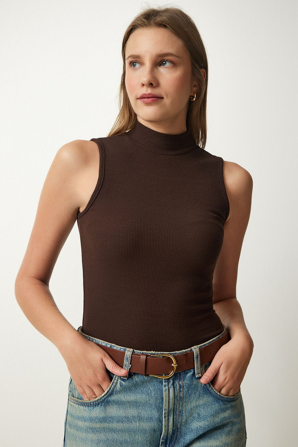Women's Cream Dark Brown Fisherman Neck Sleeveless 2 Plot Knitting Blouse GT00012