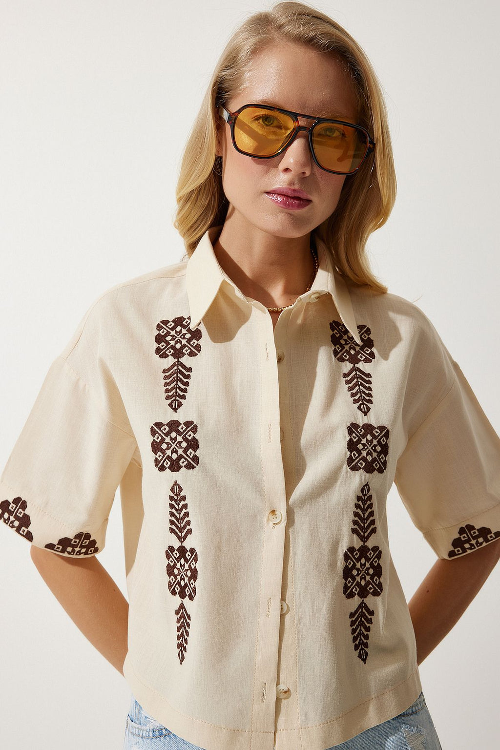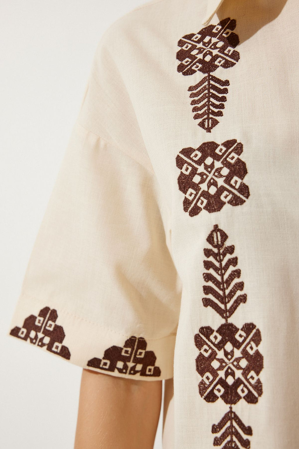 Women's Cream Embroidery Short Linen Shirt RG00009