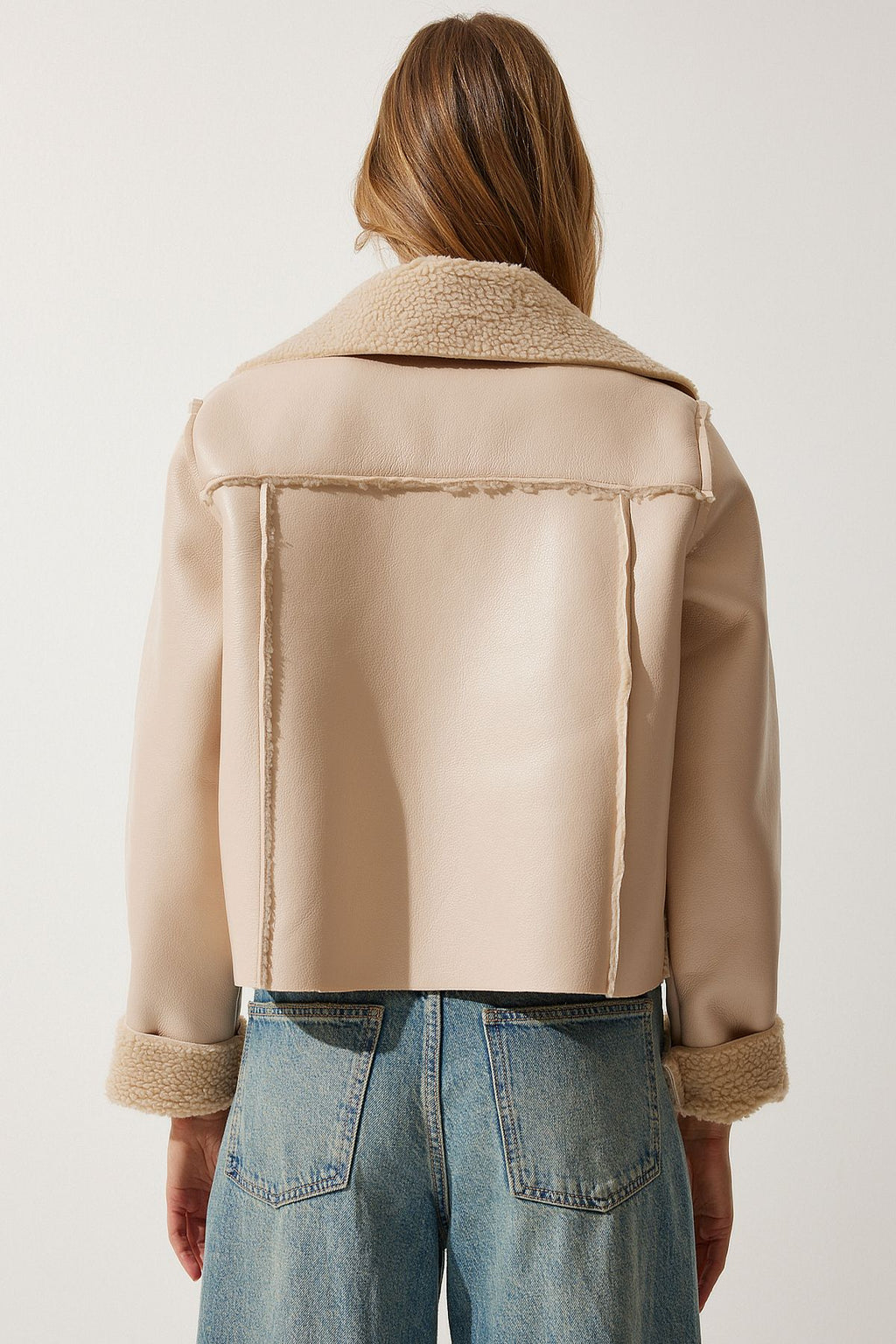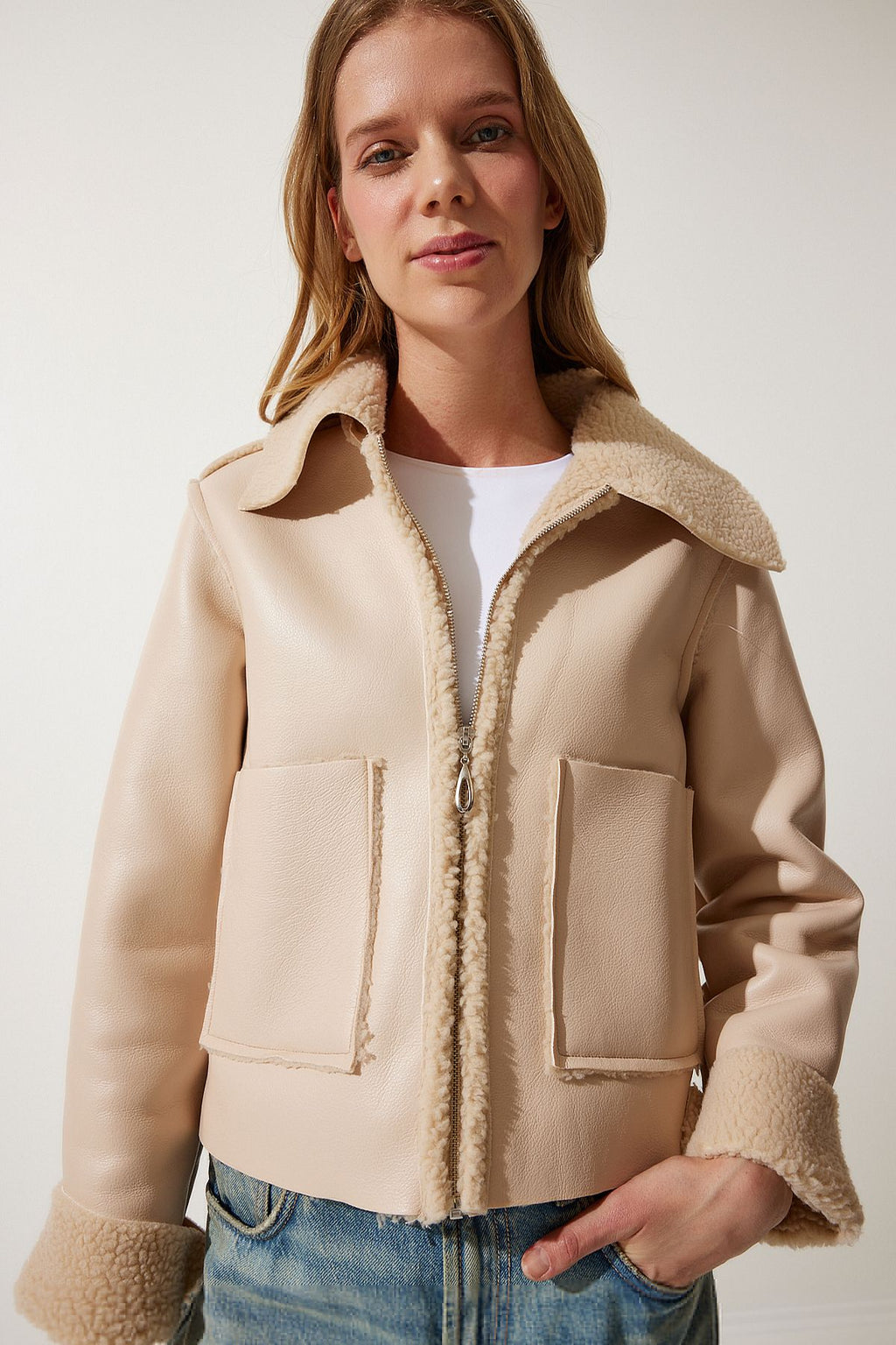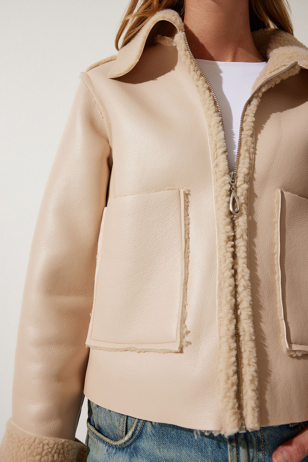 Women's Cream Fur Yaka Wide Pocket Artificial Leather Jacket TP00027