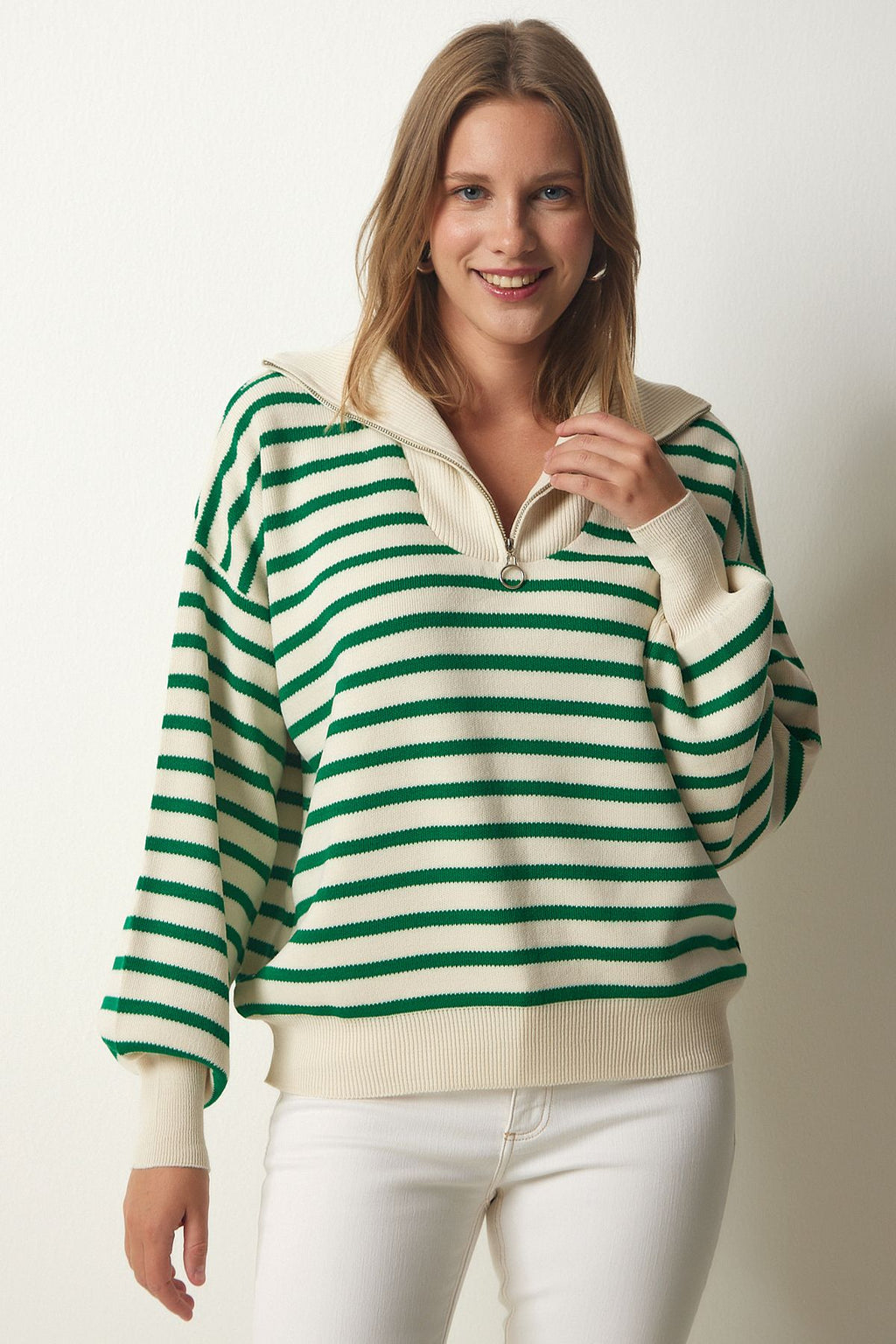 Women's Cream Green Striped Zippered Yaka Knitwear Sweater PF00039