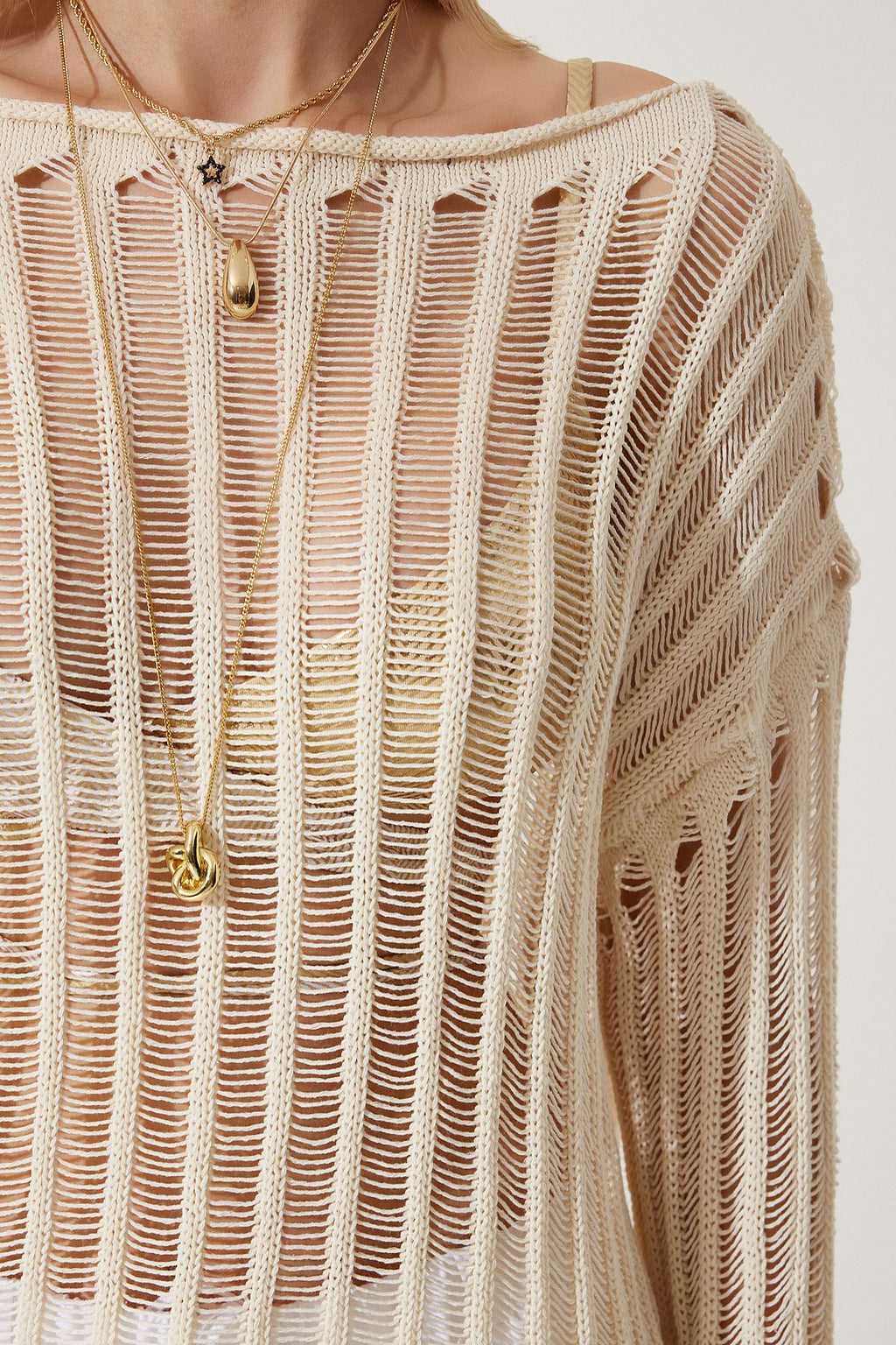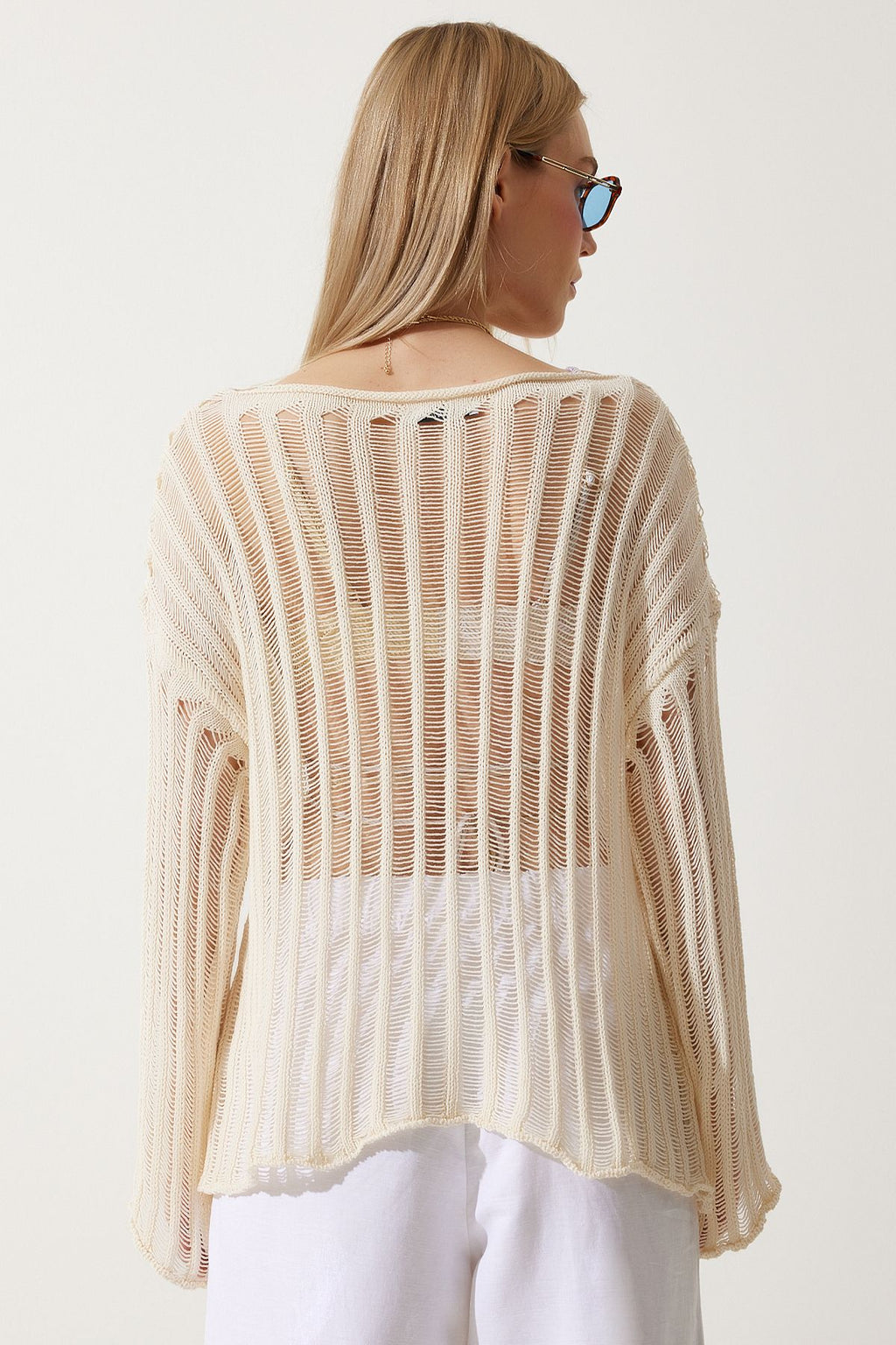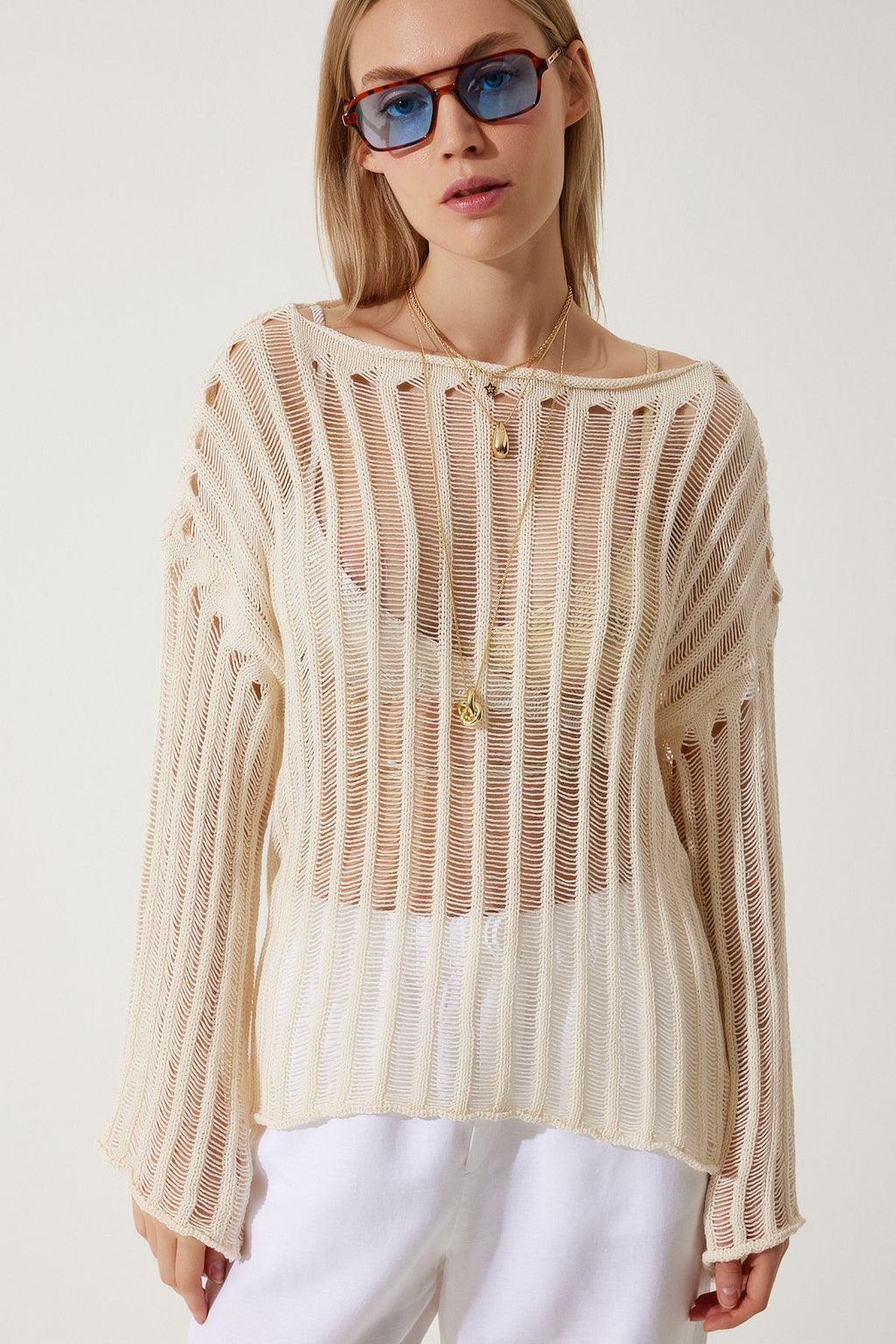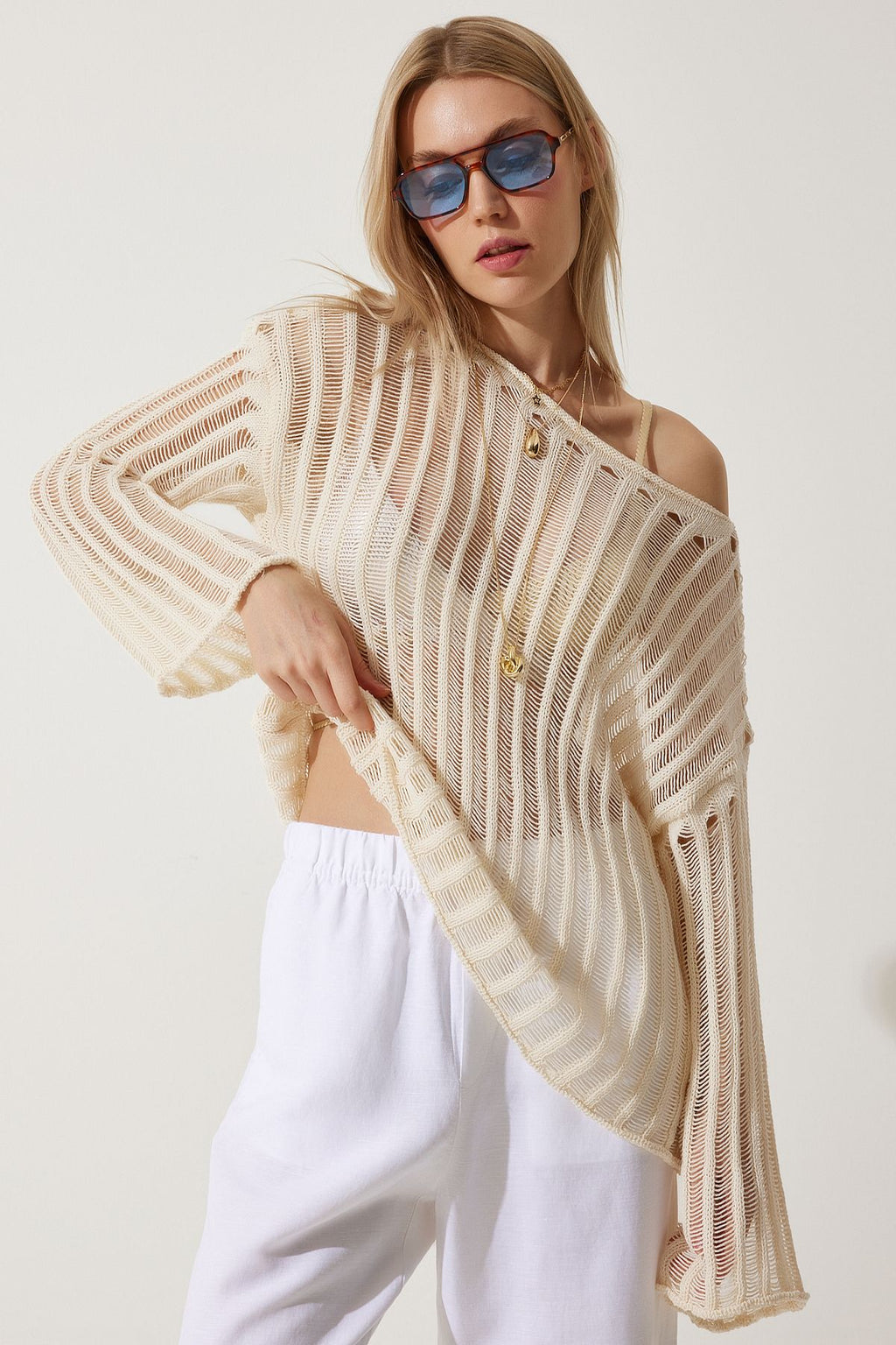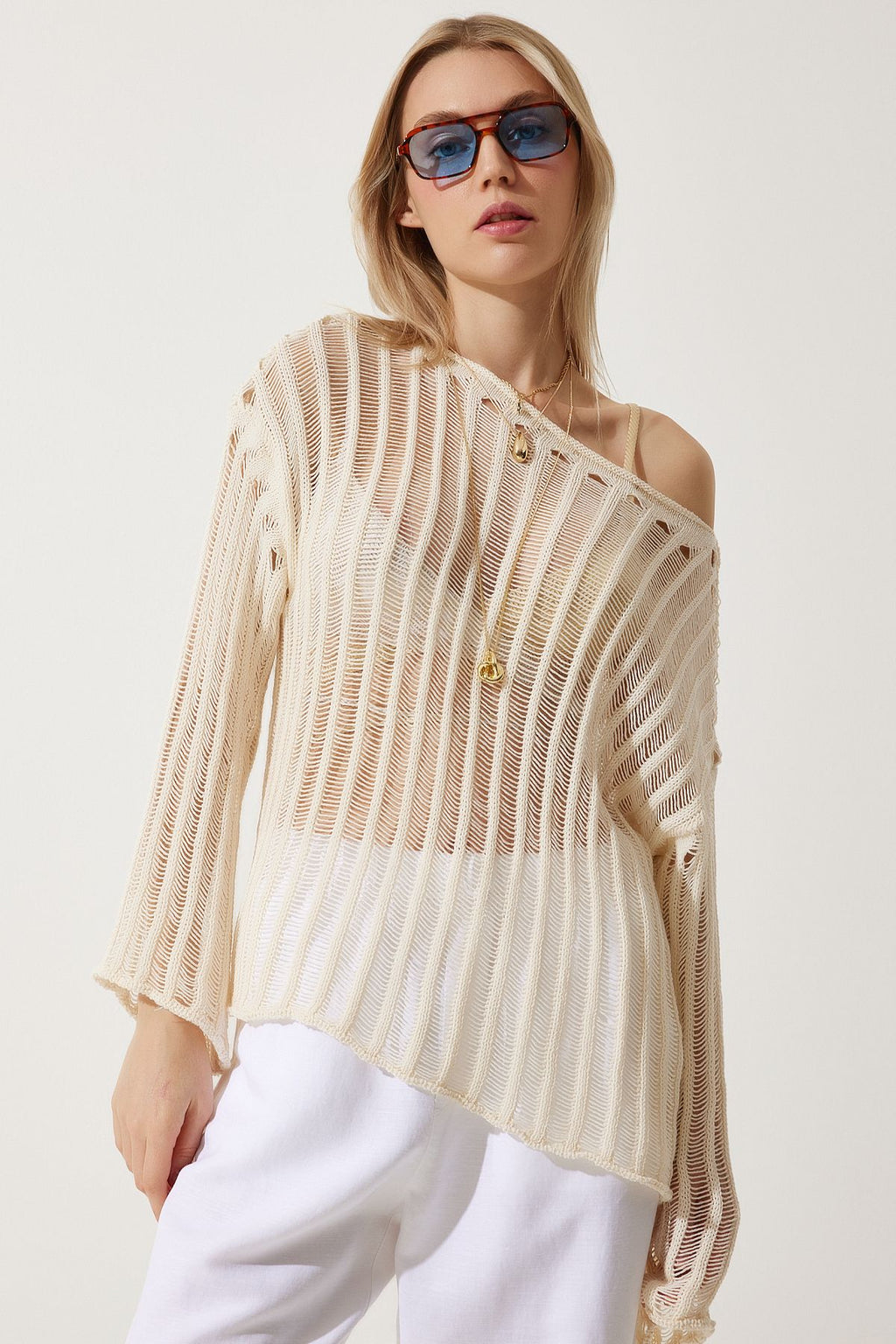 Women's Cream Low Shoulder Summer Occupational Triko Blouse MC00285