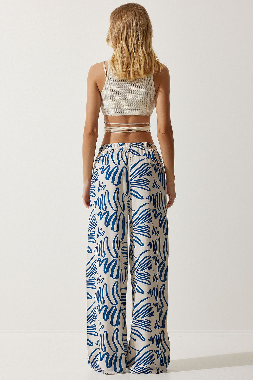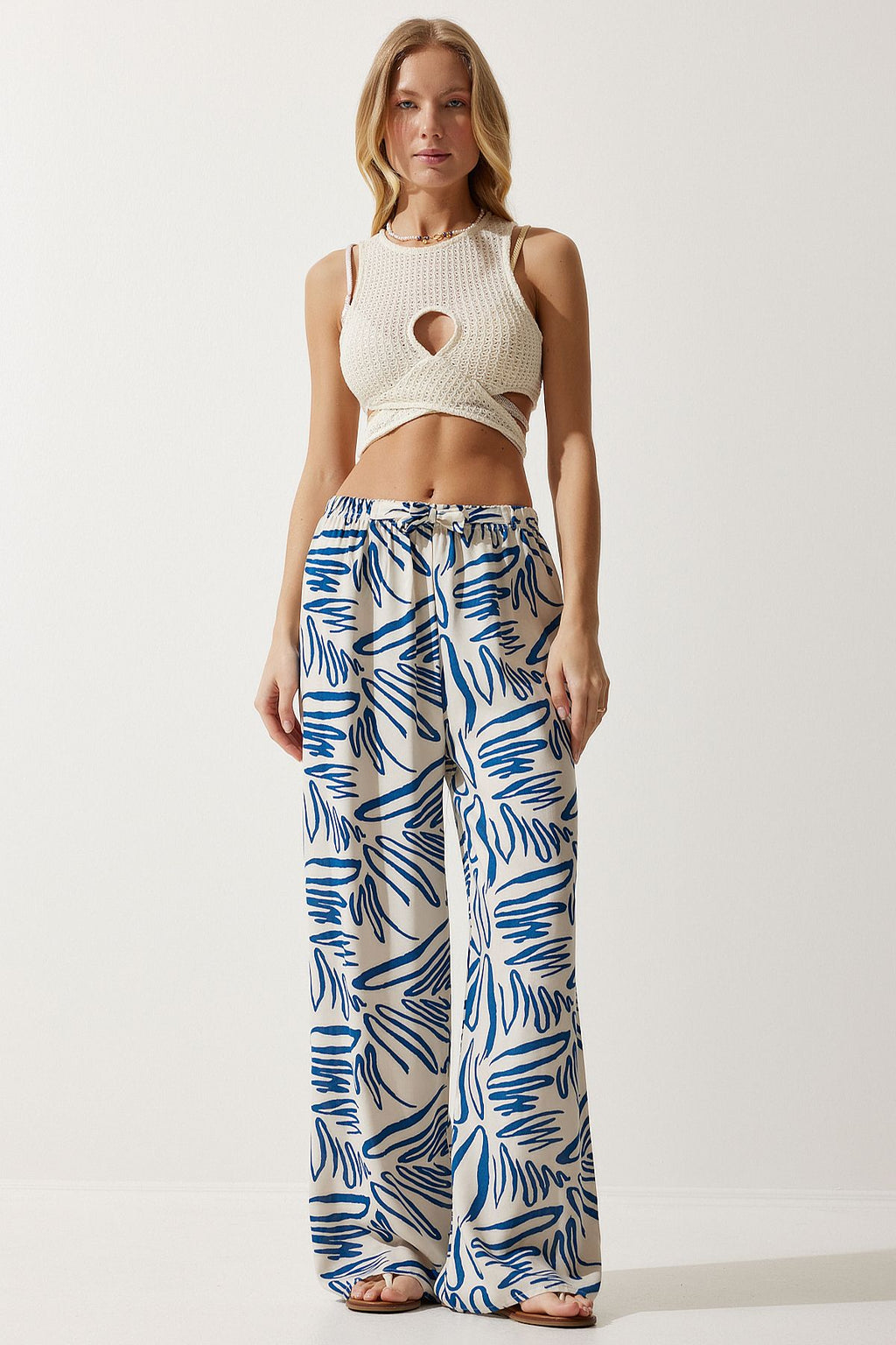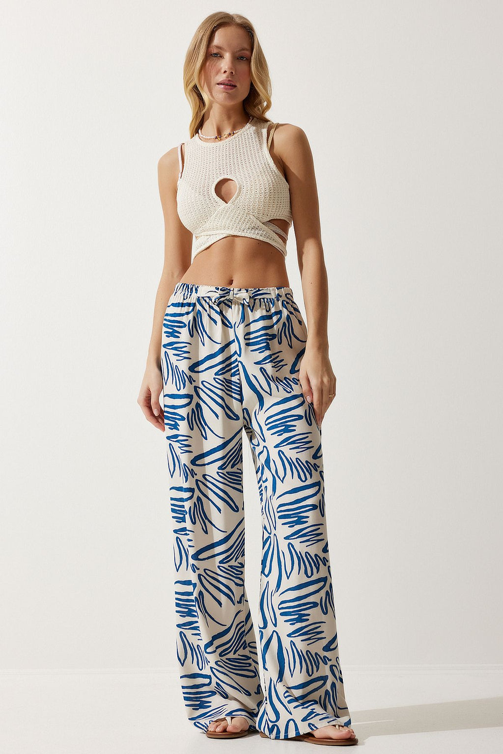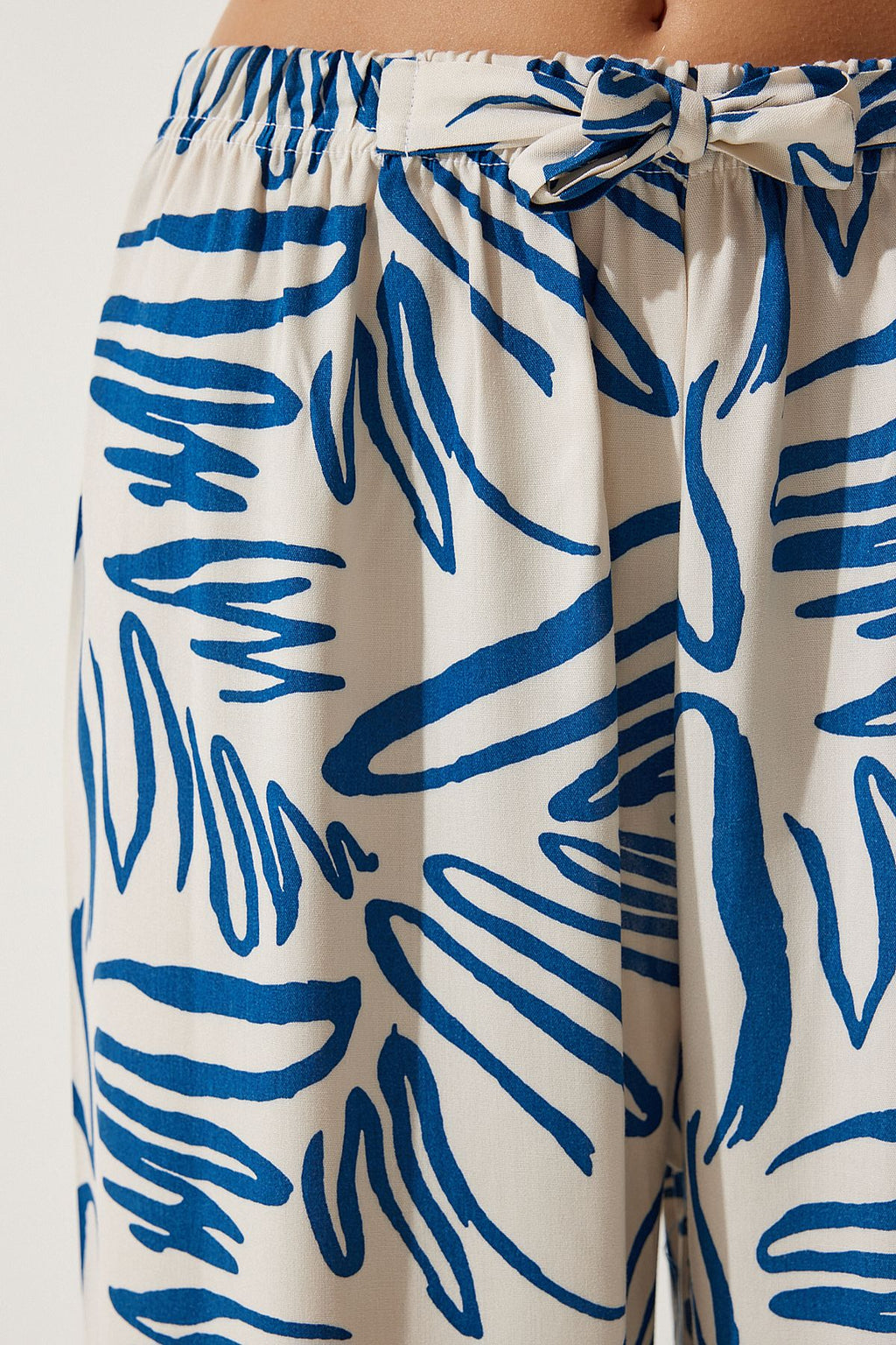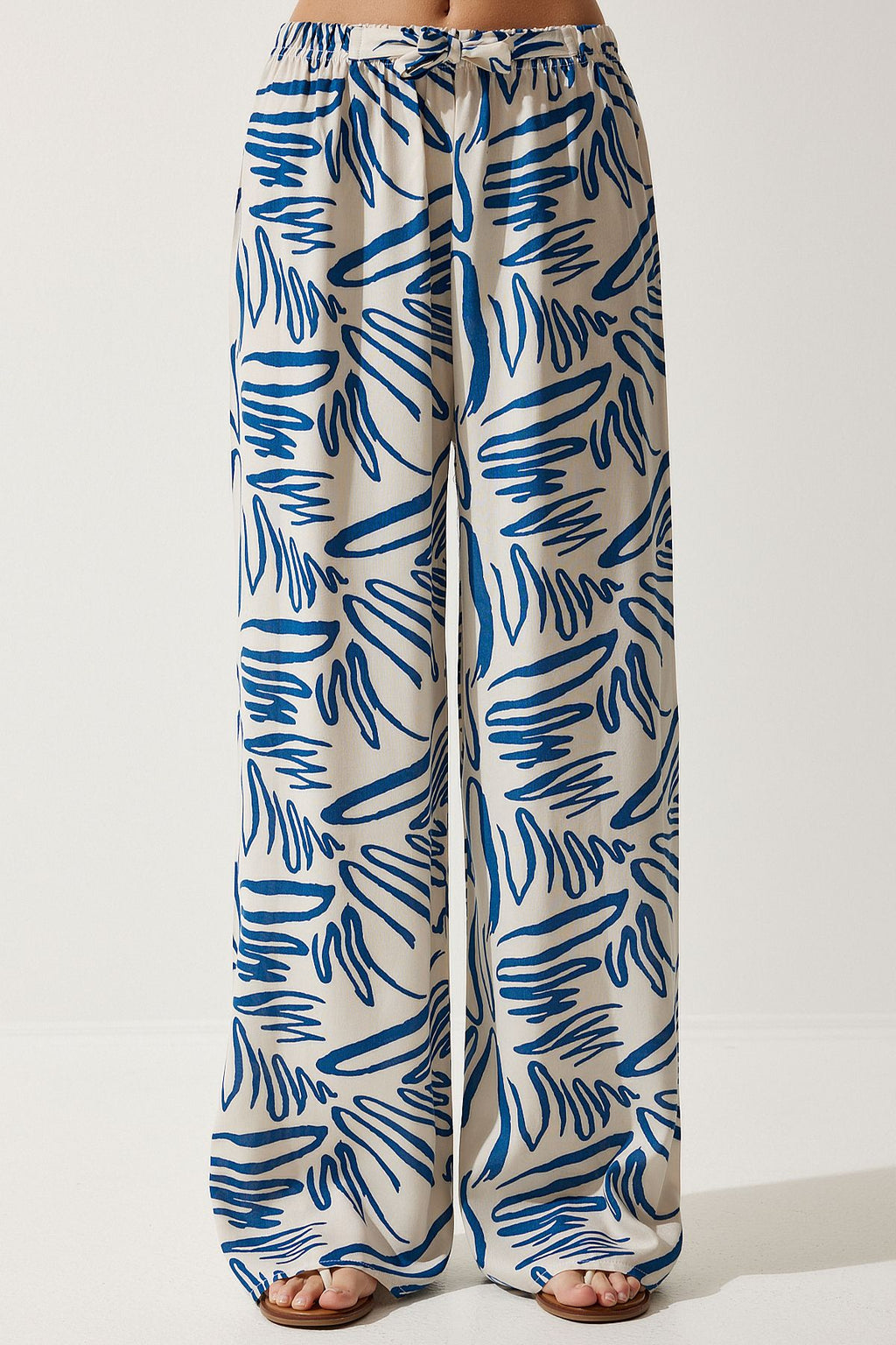 Women's Cream Navy Blue Patterned Viscose Palazzo Pants EN00606