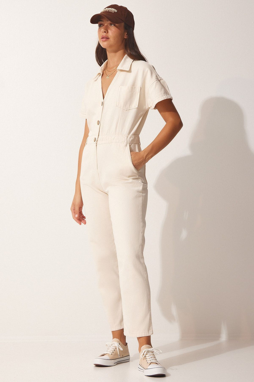 Women's cream polo collar denim tulum wf00044