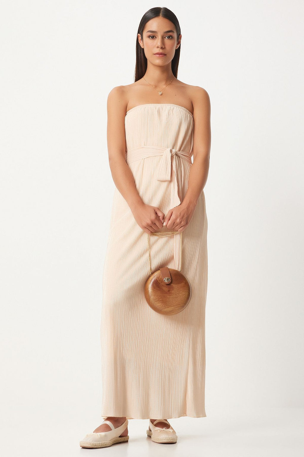 Women's Cream Strapless Born Pilicated Dress FN03237