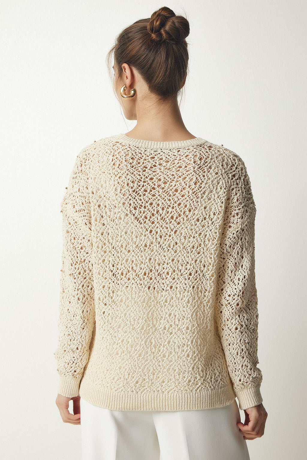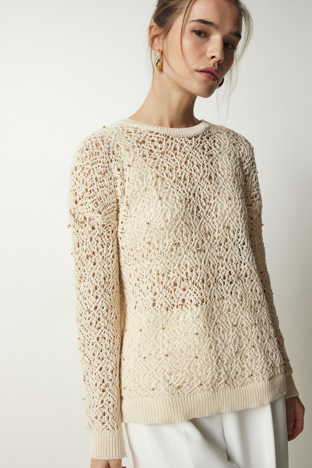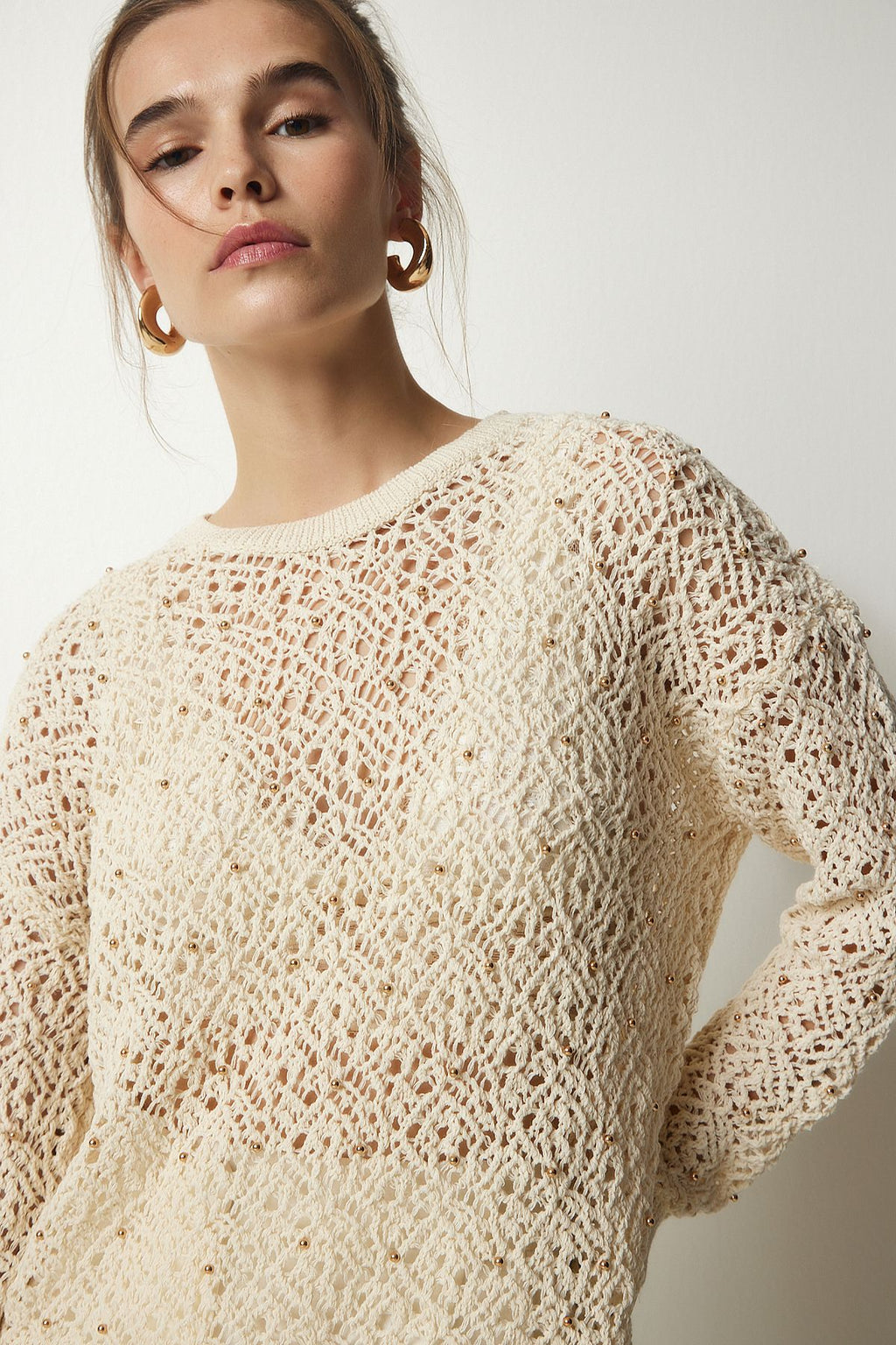 Women's Cream Stylish Pearl Detailed Offer Knitwear Sweater PF00025