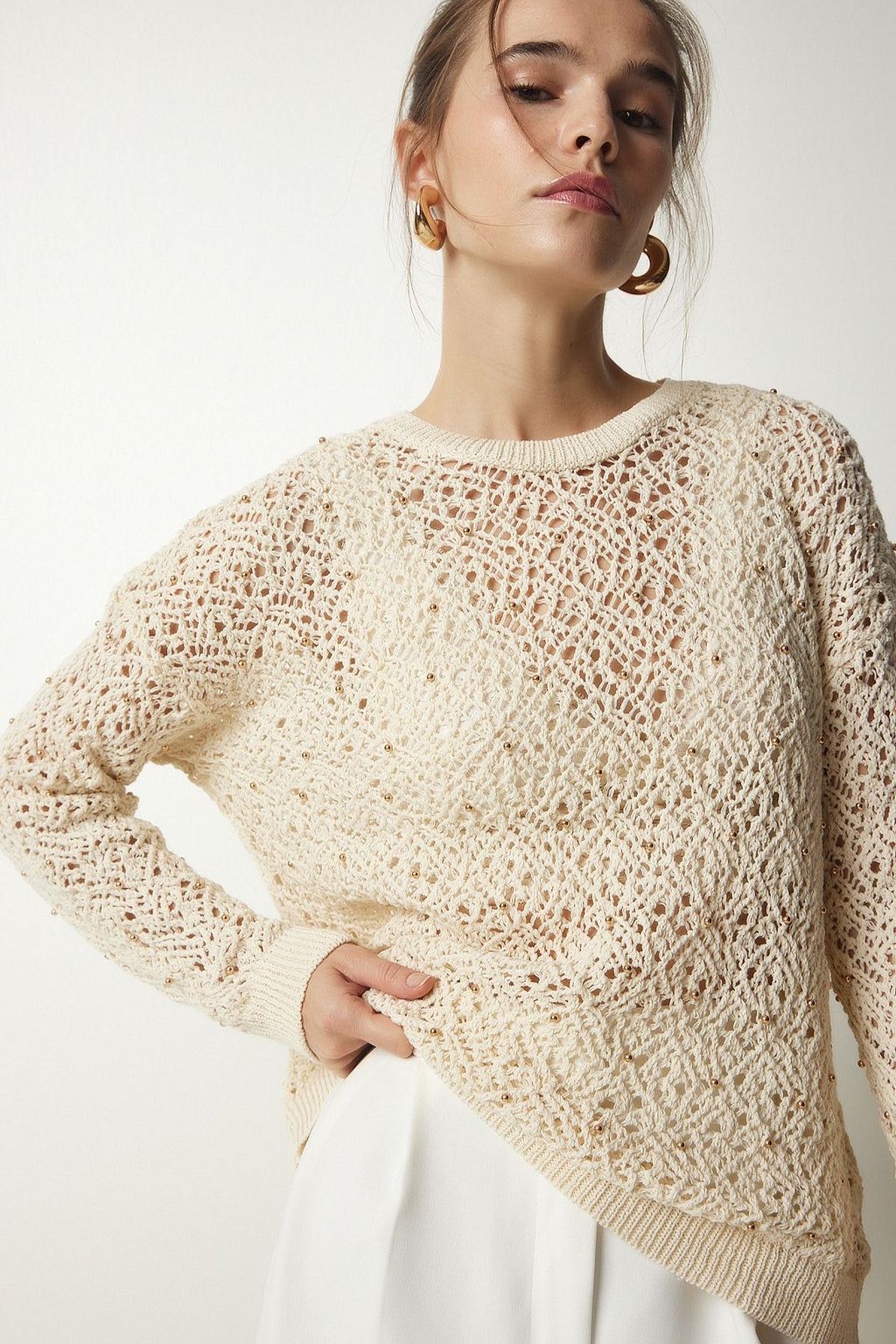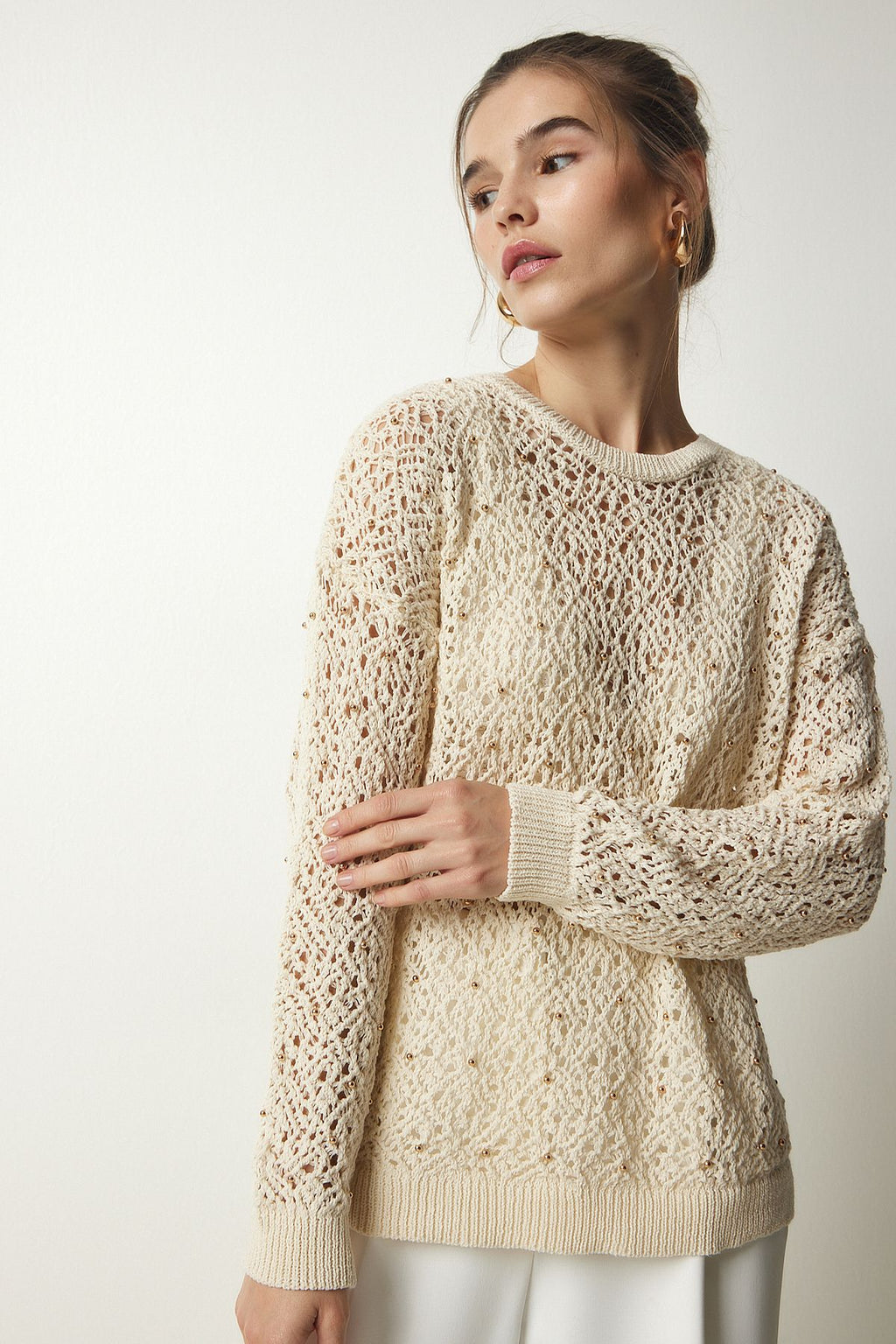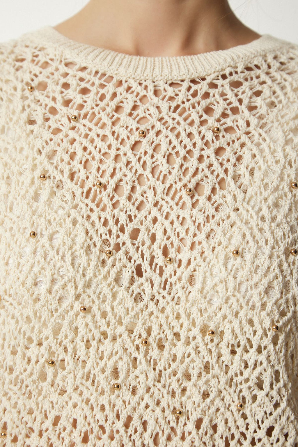 Women's Cream Stylish Pearl Detailed Offer Knitwear Sweater PF00025