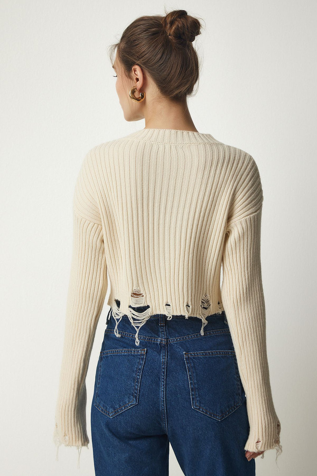 Women's Cream Torn Detailed Triko Crop sweater YY00181