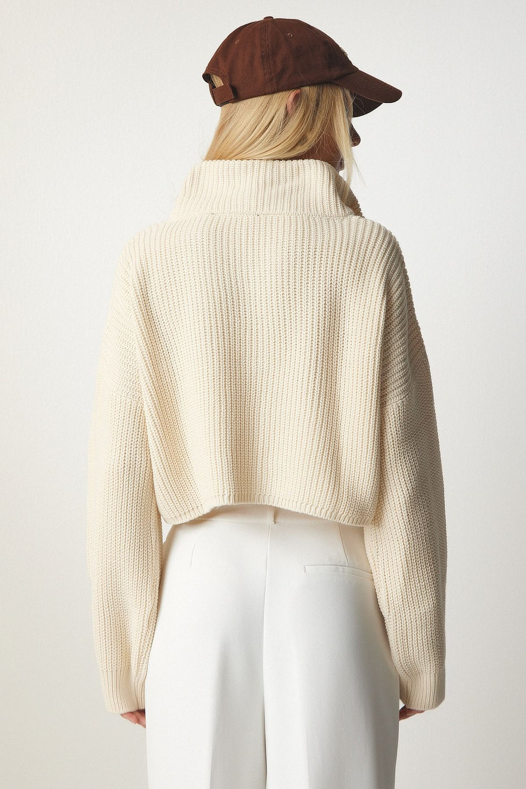 Women's Cream Zippered Fisherman Neck Knitwear Sweater MX00124