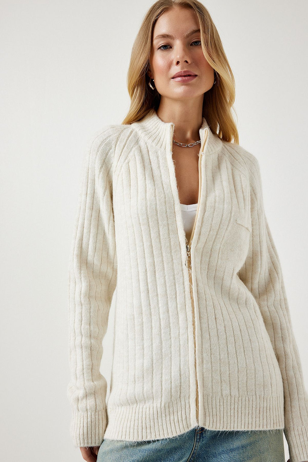Women's Cream Zippered Knitwear Cardigan DD01301