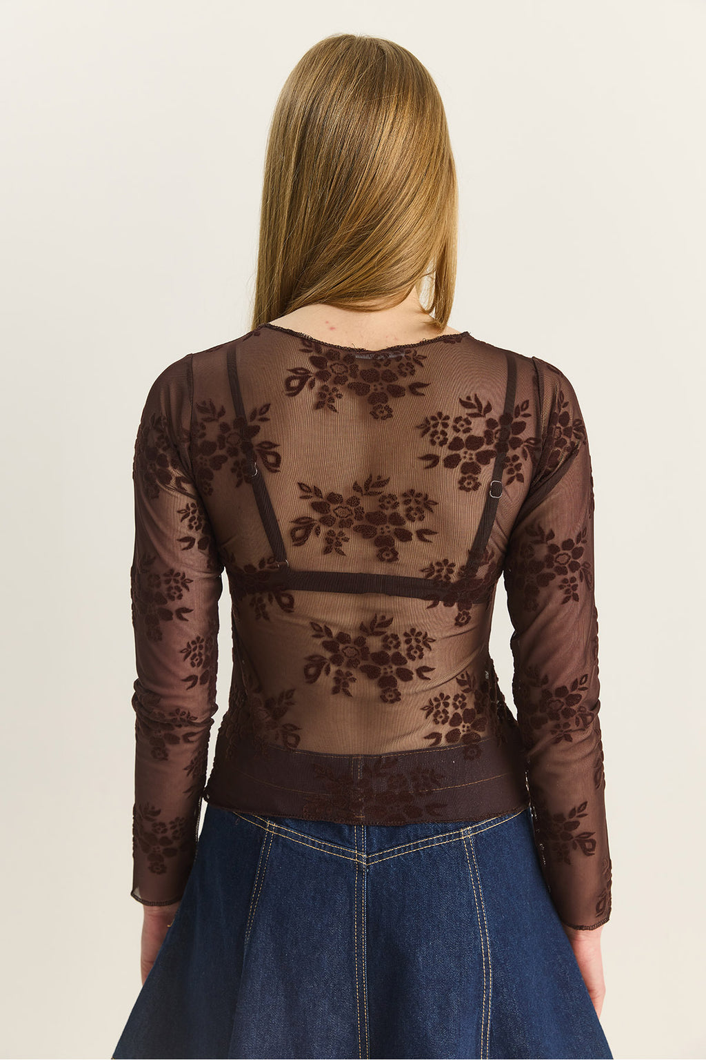 Women's Crew Neck Gathered Sides Patterned Transparent Tulle Blouse 6114 60283926