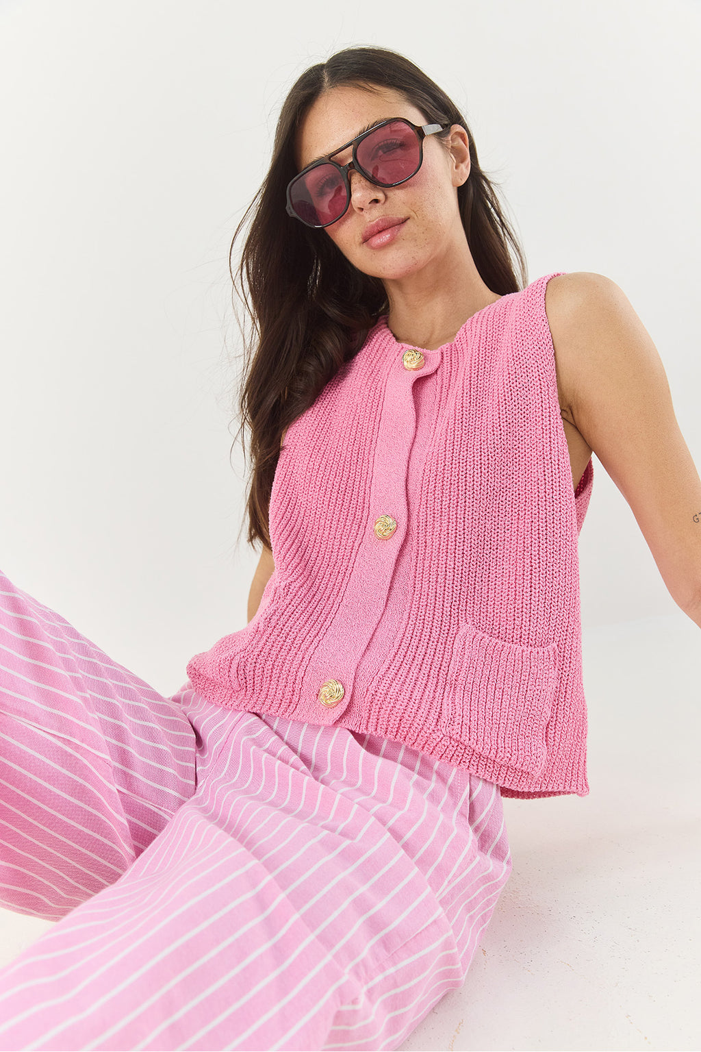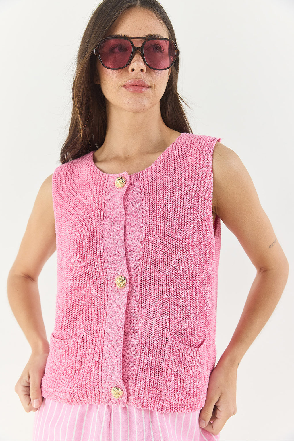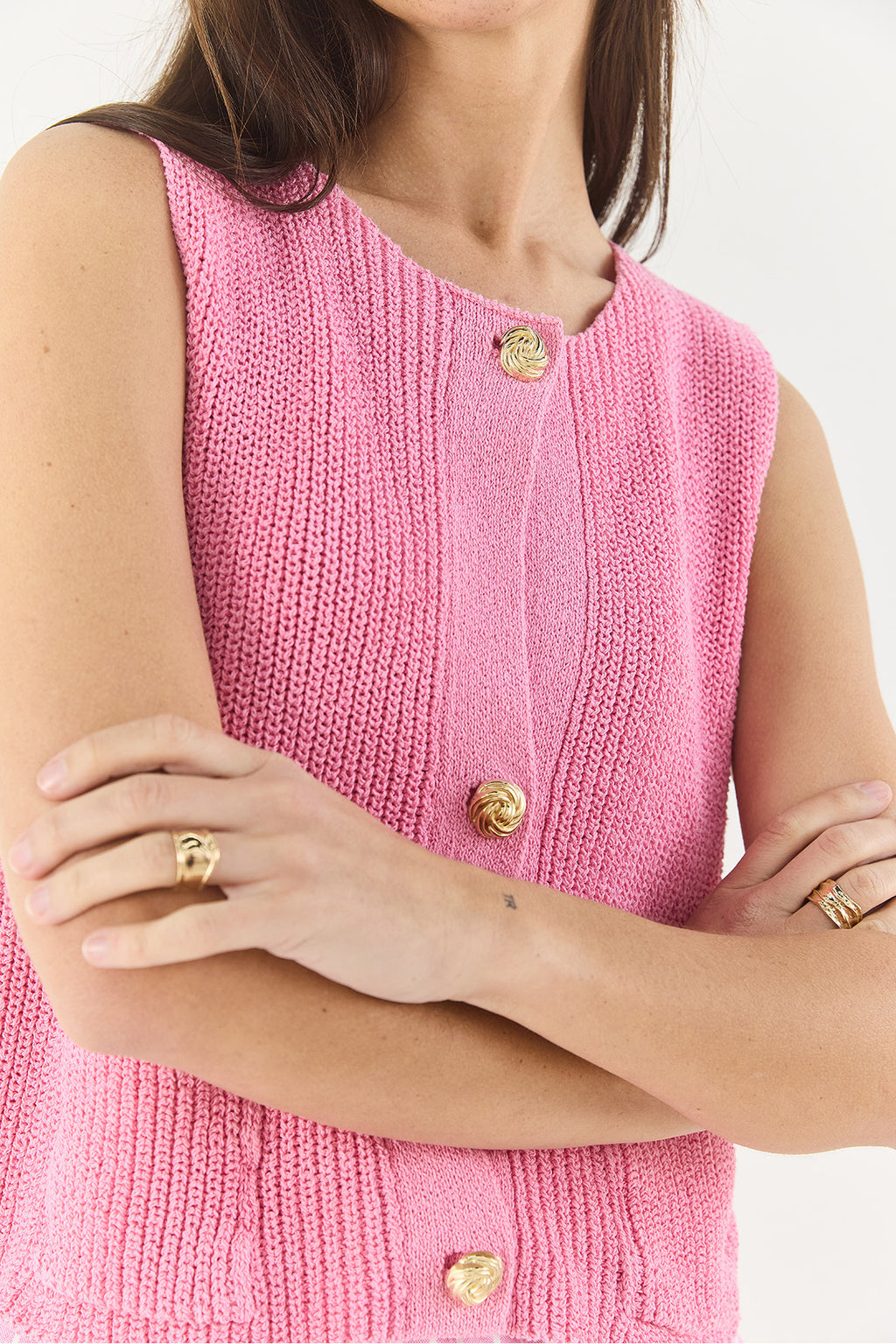 Women's Crew Neck Gold Button Detailed Zero Sleeve Knitted Vest TY251001 60283265