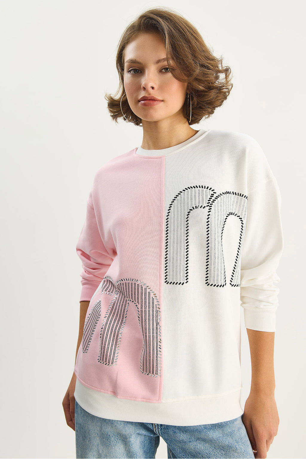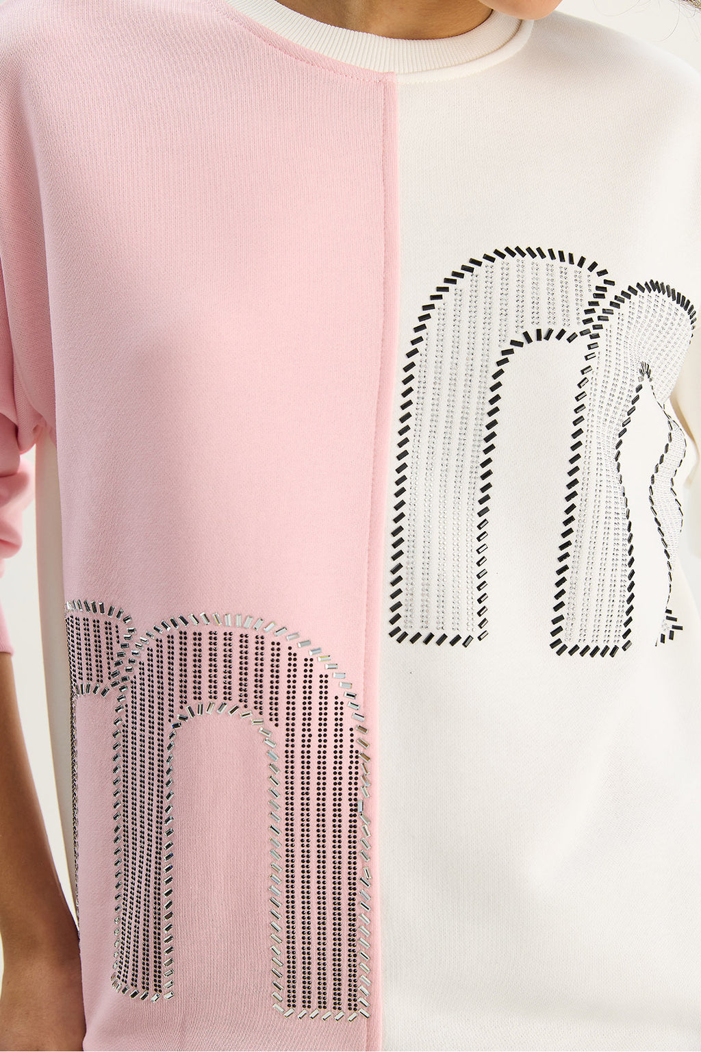 Women's Crew Neck Stone Embroidered Color Block Oversize Sweatshirt 1453 60283634
